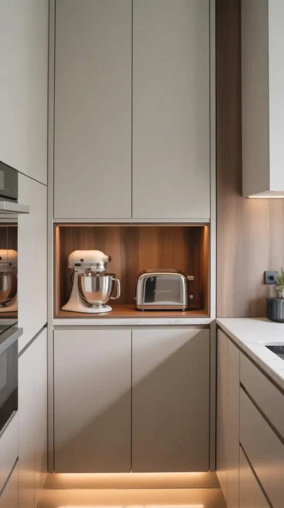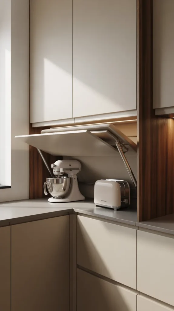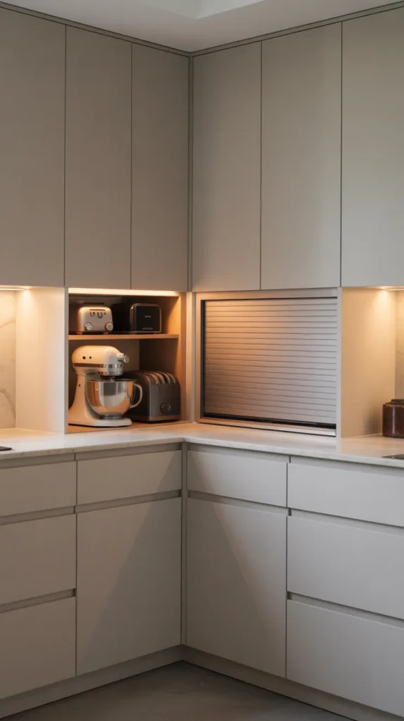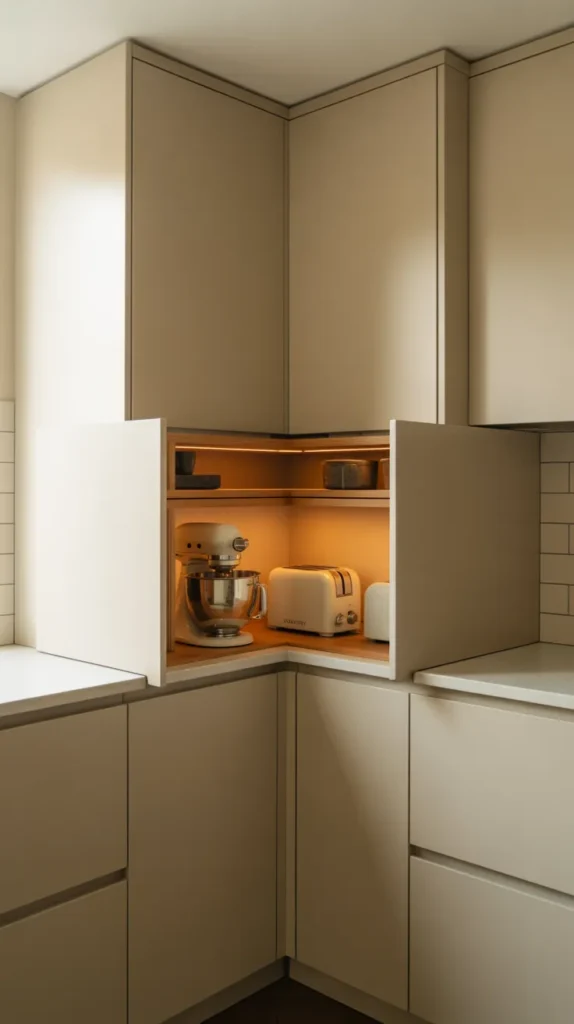 A corner appliance garage hides bulky appliances while keeping them easily accessible. This is ideal for mixers, blenders, or toasters that clutter countertops.