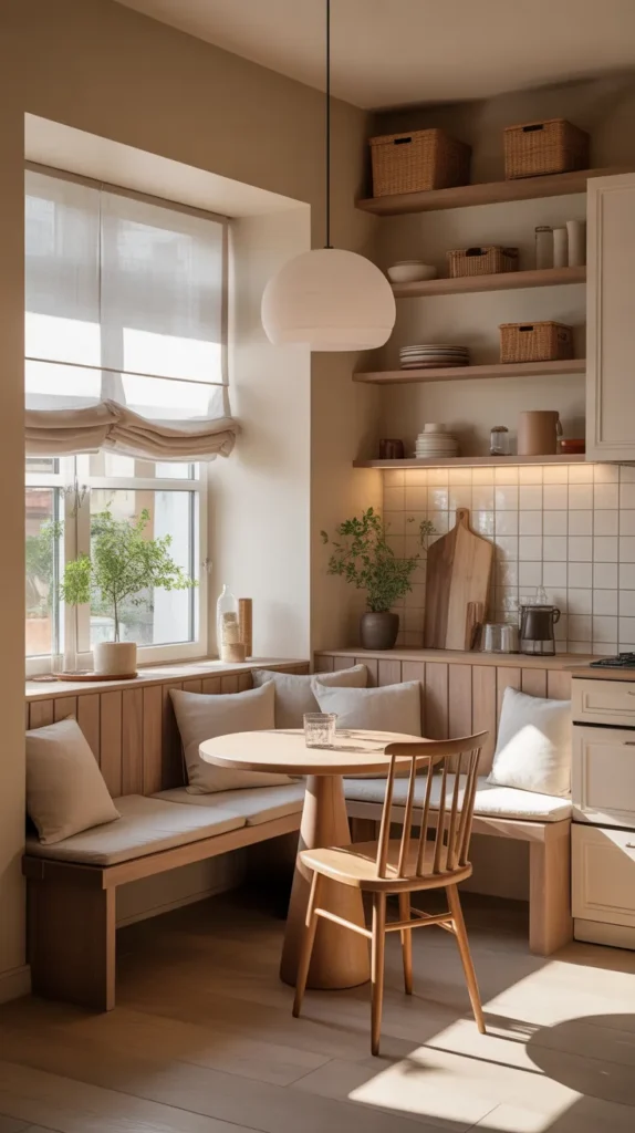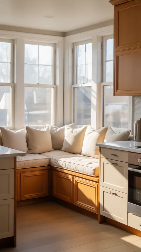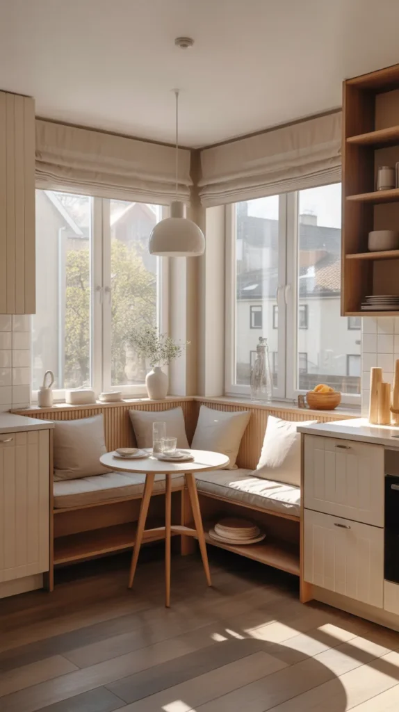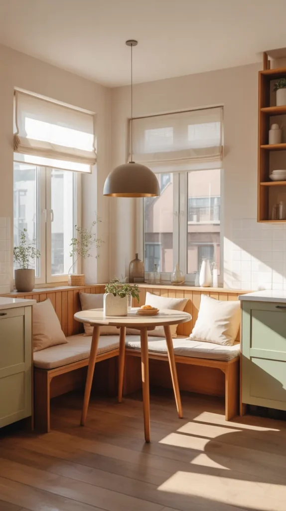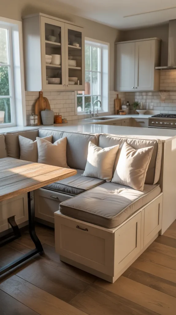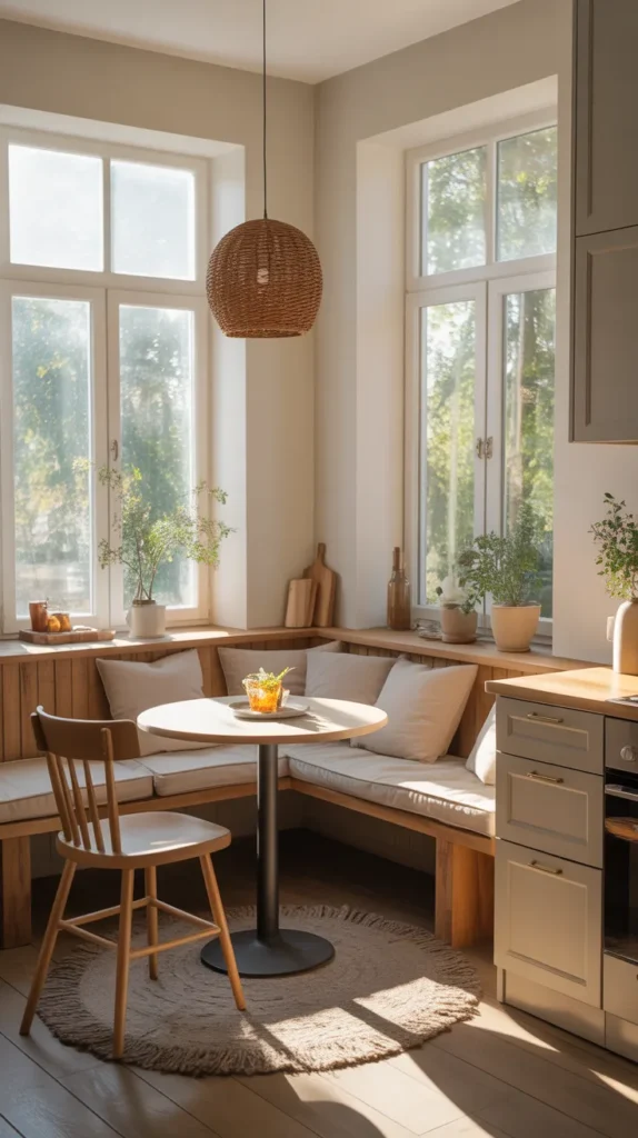 A corner breakfast nook transforms an unused kitchen corner into a warm, inviting dining space. This idea is especially popular in compact kitchens where a full dining table isn’t practical. A built-in bench along two adjoining walls maximizes seating while maintaining a cozy atmosphere.