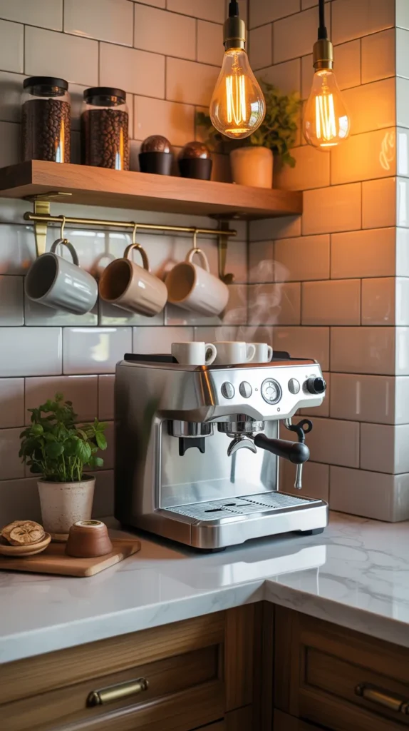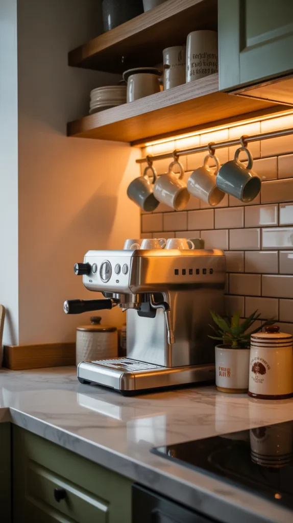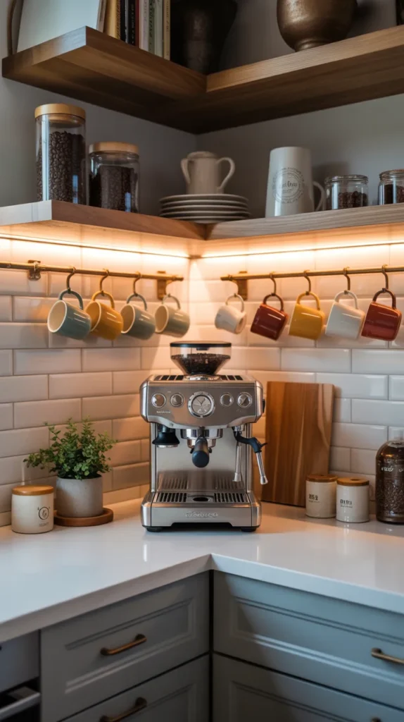 You can include shelves for mugs, a compact coffee machine, storage for beans and accessories, and even a small chalkboard menu. Using a corner keeps the station separate from cooking zones.