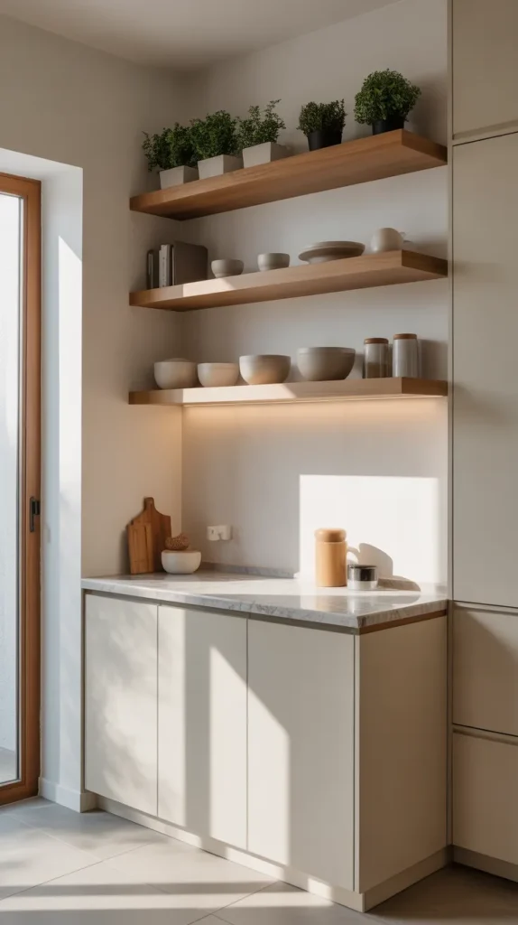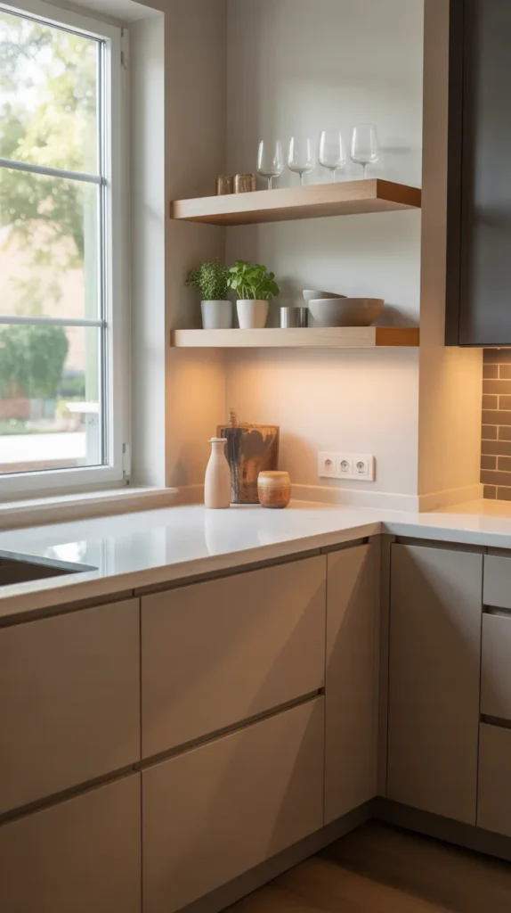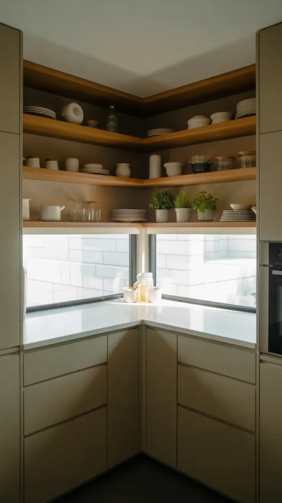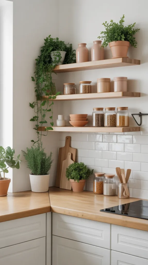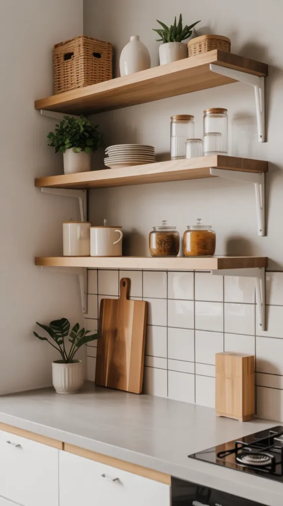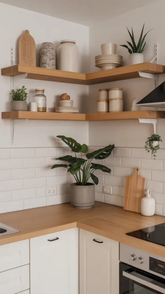 Floating corner shelves are perfect for adding both storage and style without overwhelming the space. They work exceptionally well in small kitchens where heavy cabinets may feel bulky.