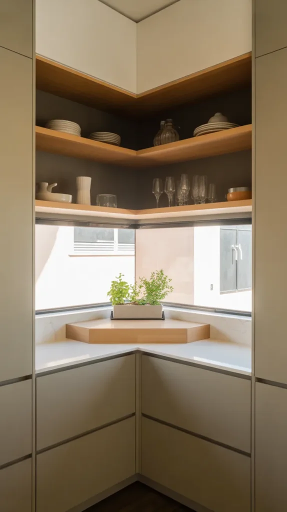 A kitchen corner herb garden brings freshness and greenery into your cooking space. Whether you choose wall-mounted planters or small pots on shelves, herbs add both beauty and functionality.