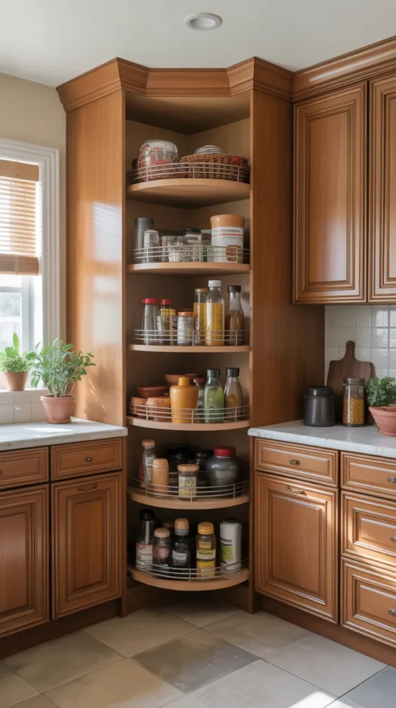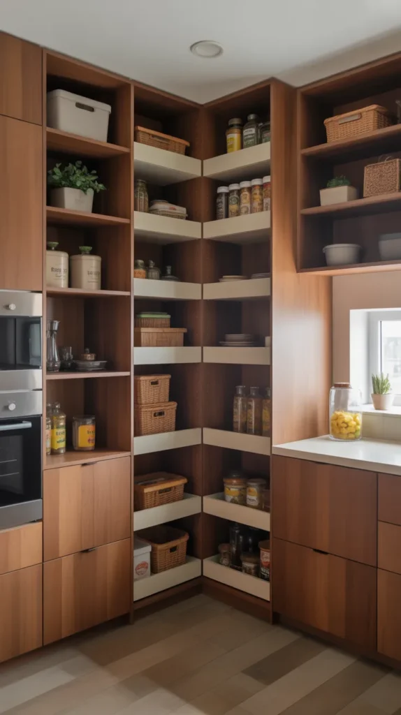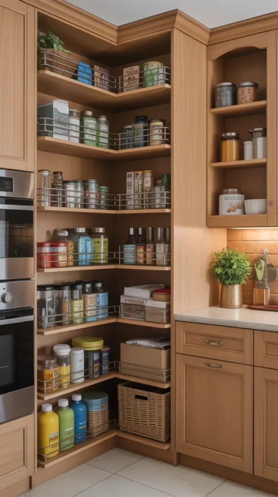 Lazy Susans, pull-out racks, and vertical shelving systems are ideal for corner pantries. They allow you to store dry goods, spices, snacks, and even small appliances without cluttering countertops. This idea is especially useful in modular kitchens.