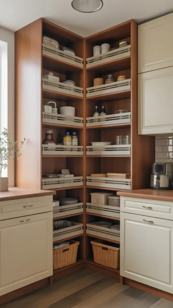 A corner pantry is one of the smartest ways to use deep corner spaces efficiently. Instead of awkward shelves where items get lost, a well-designed corner pantry provides easy access and organized storage.