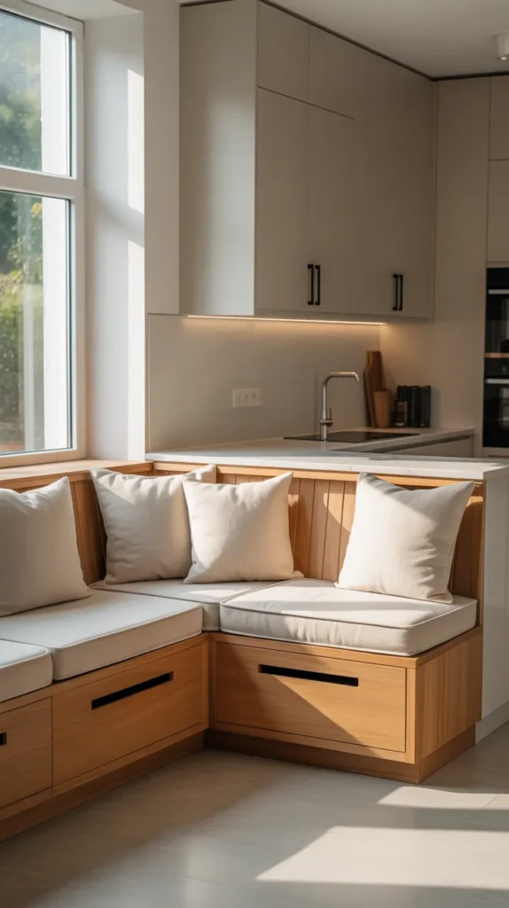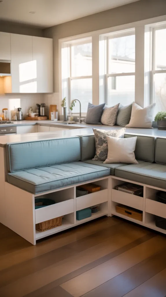 Corner seating with built-in storage is a multifunctional solution for family kitchens. It provides extra seating while hiding items like linens or cookware.