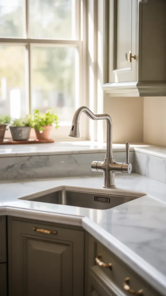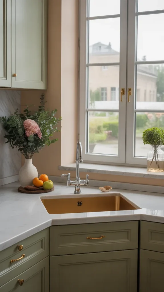 A corner sink also adds a unique design element, breaking the monotony of straight kitchen layouts. Pair it with a stylish faucet and backsplash for maximum impact.