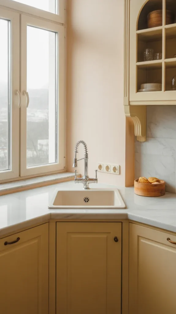 Installing a sink in the corner is a clever way to free up central counter space. Corner sinks work well in L-shaped or U-shaped kitchens, improving workflow and ergonomics.