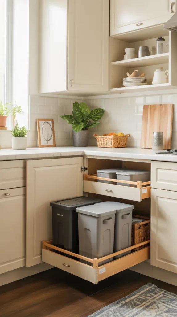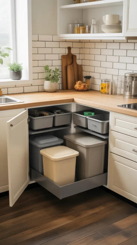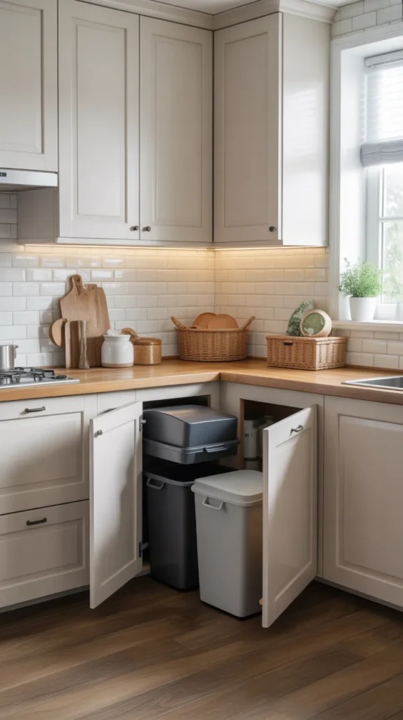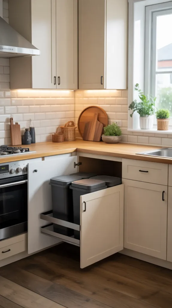A hidden corner trash and recycling station keeps waste management discreet and hygienic. Pull-out bins inside cabinets work best for this purpose.