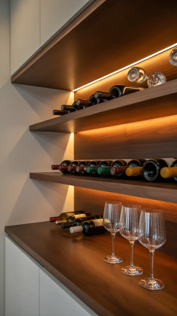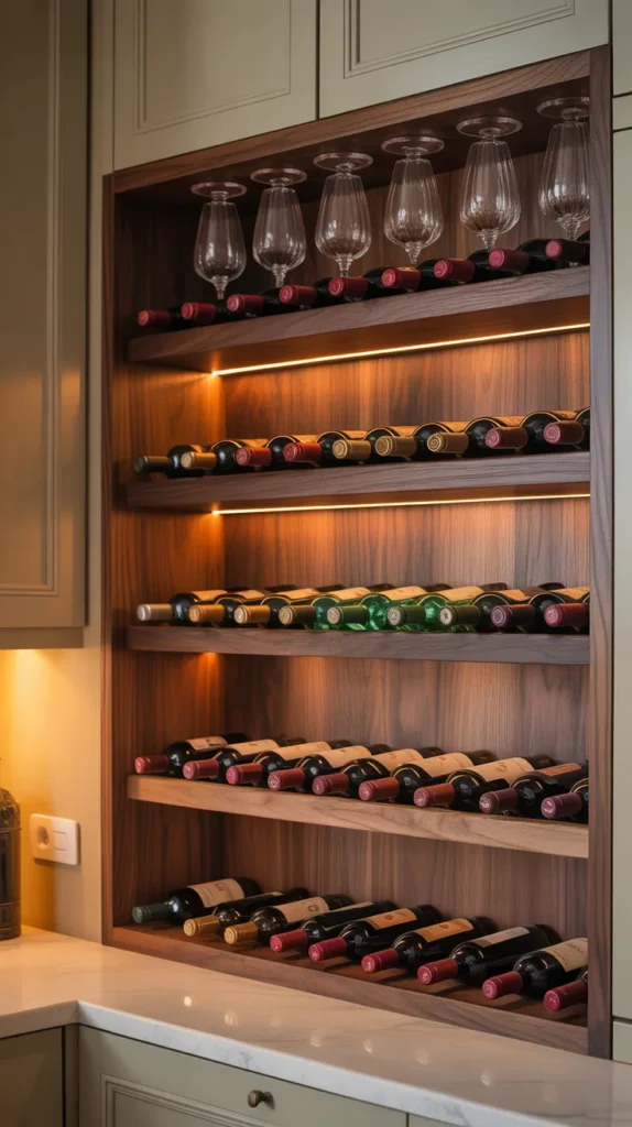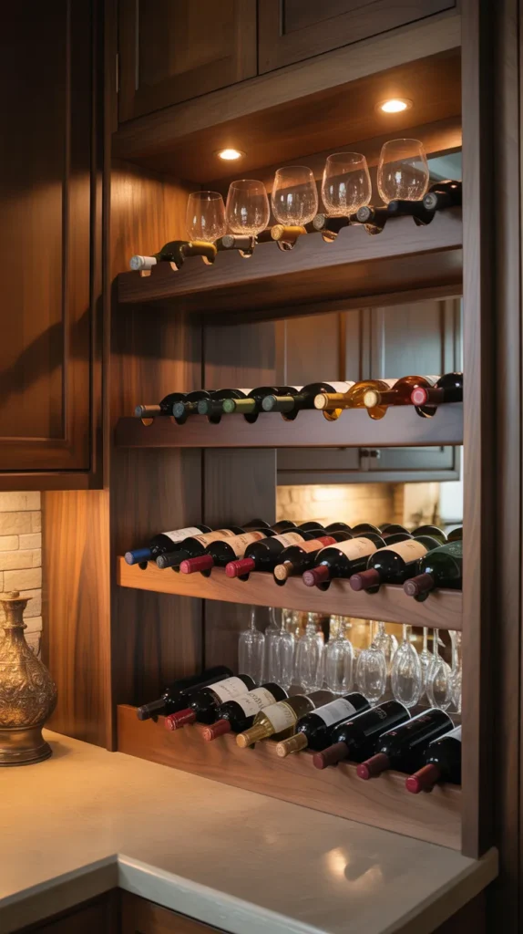 This idea works well in both modern and rustic kitchens. Combine wine storage with glass holders for a complete mini bar feel.