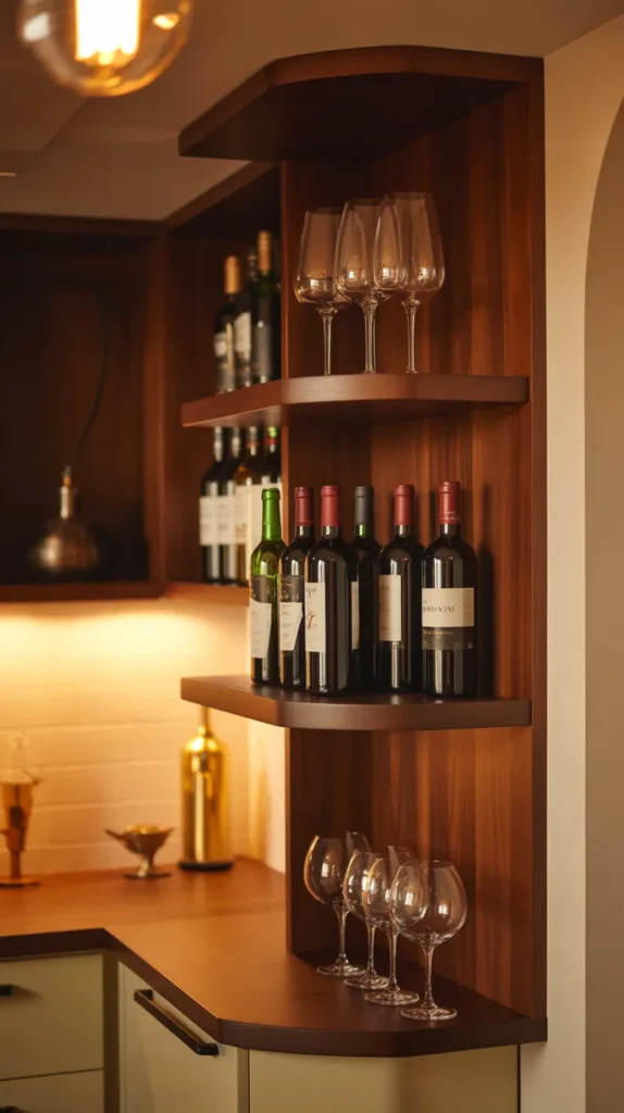 A corner wine rack adds sophistication and functionality, especially for wine enthusiasts. Vertical racks or custom shelving make excellent use of narrow corner spaces.