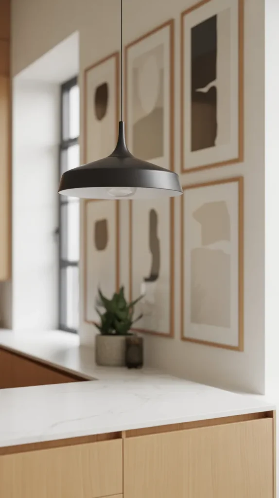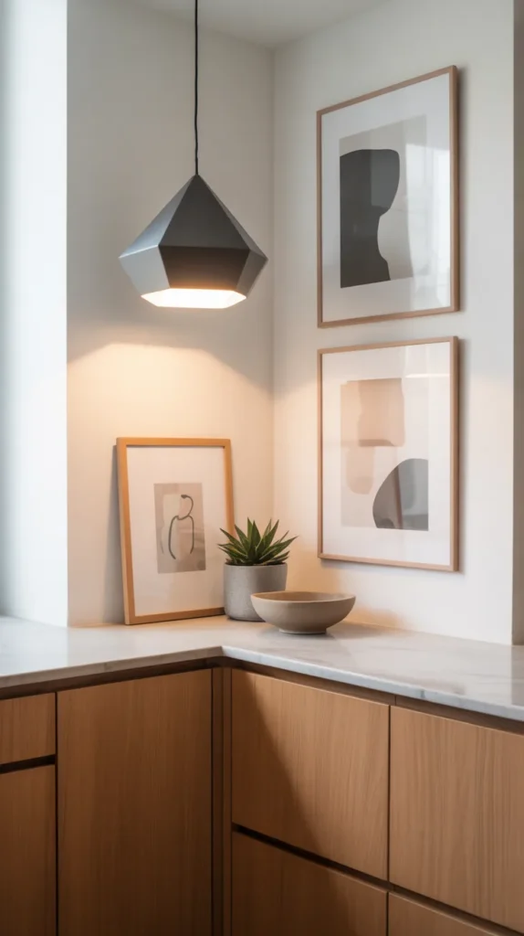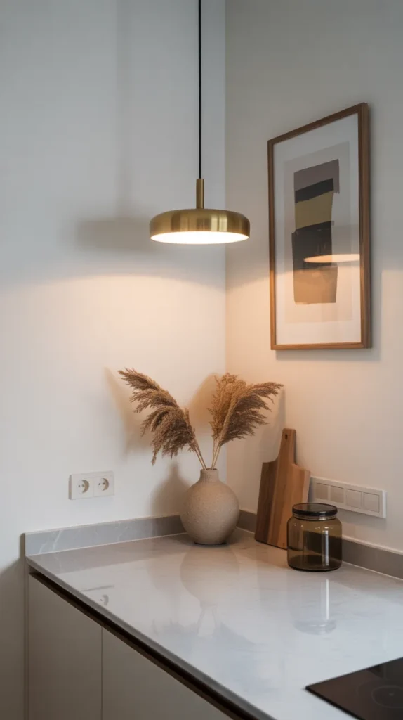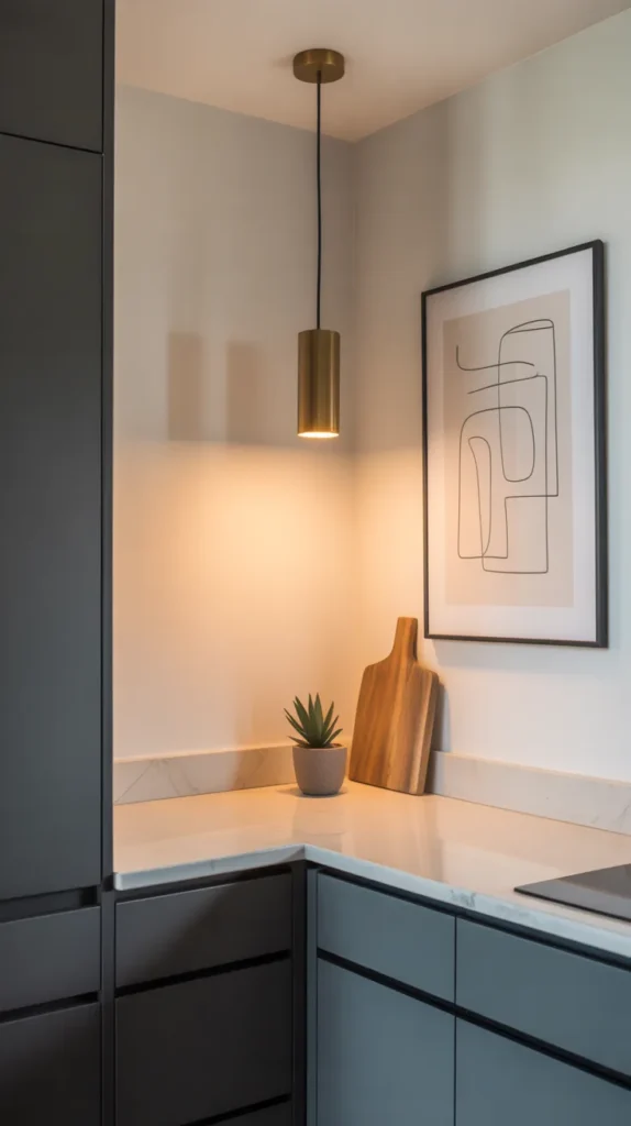 Not every kitchen corner needs heavy functionality. A decorative corner can enhance visual appeal using artwork, vases, or statement lighting.