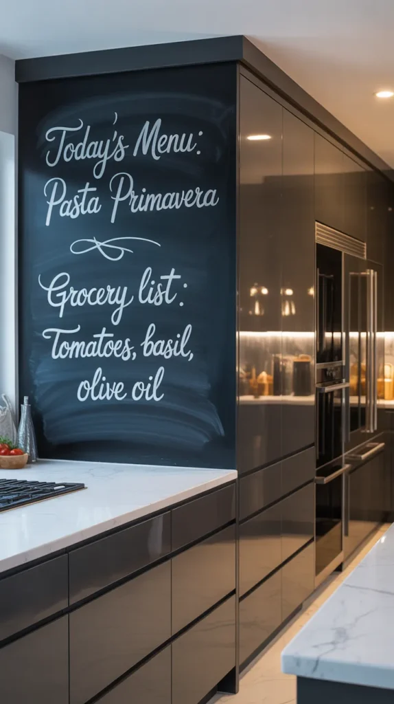 Chalkboard walls work especially well in modern, industrial, or casual kitchens. You don’t need to paint the entire wall—creating a framed chalkboard section is often enough. If you prefer a cleaner look, a whiteboard wall offers similar functionality with a more polished feel.