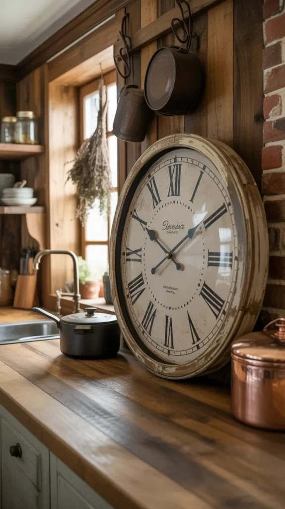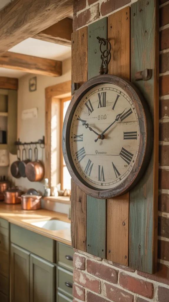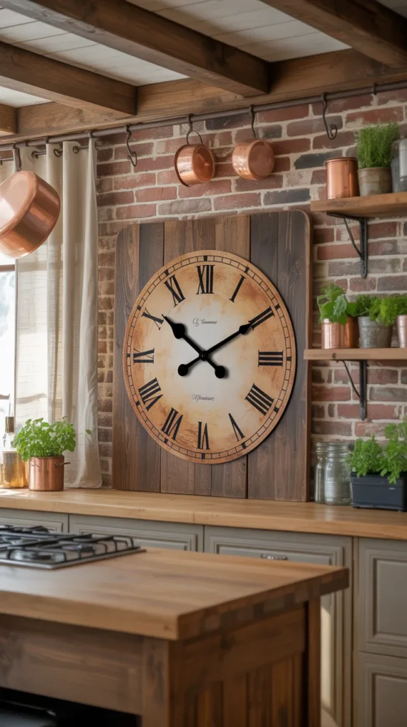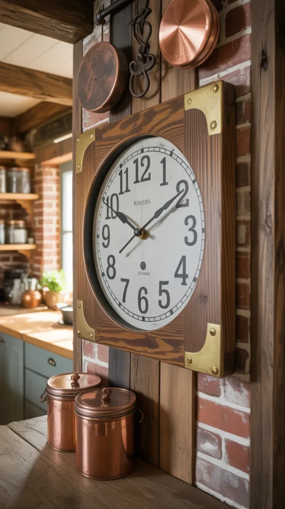 Choose a clock that matches your kitchen’s theme—industrial, rustic, or modern. This idea adds structure and balance to empty walls.