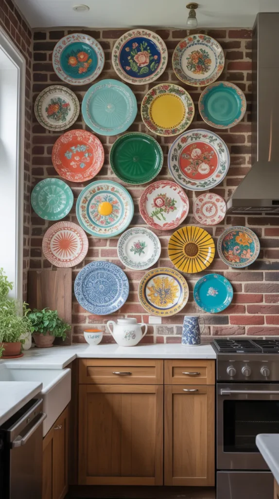 Arrange plates symmetrically for a formal look or asymmetrically for a more artistic feel. This idea works beautifully in farmhouse, traditional, or eclectic kitchens.
