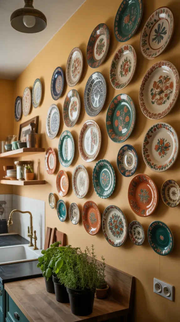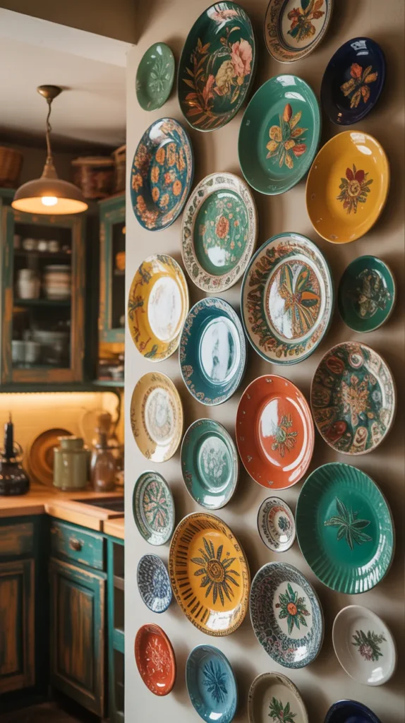 Decorative plates are a classic kitchen wall decor idea that never goes out of style. You can display vintage plates, hand-painted ceramics, or modern patterned dishes using wall mounts. This adds color, texture, and cultural charm to your kitchen.