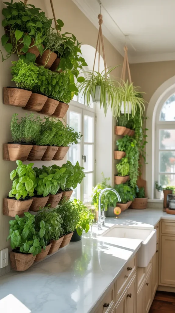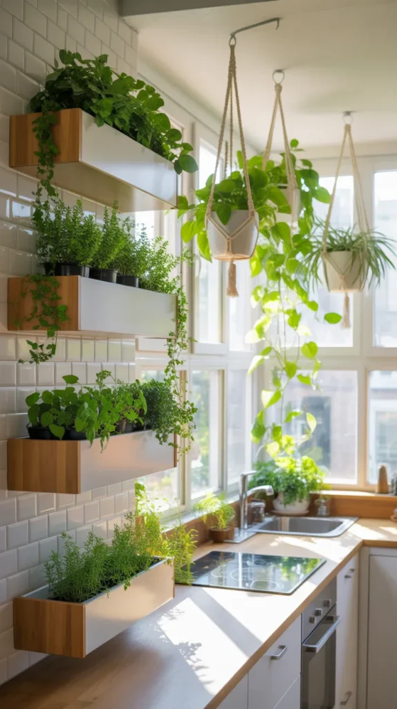 Herbs like basil, mint, and rosemary are especially practical, as you can use them while cooking. For low-maintenance options, consider pothos or artificial plants. This decor idea works well in both modern and rustic kitchens.