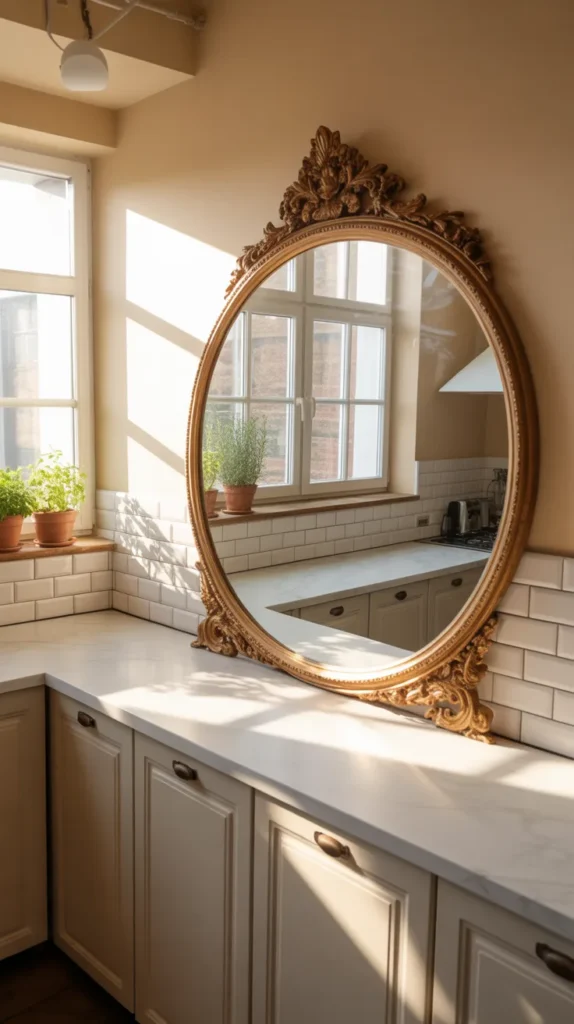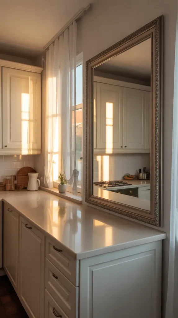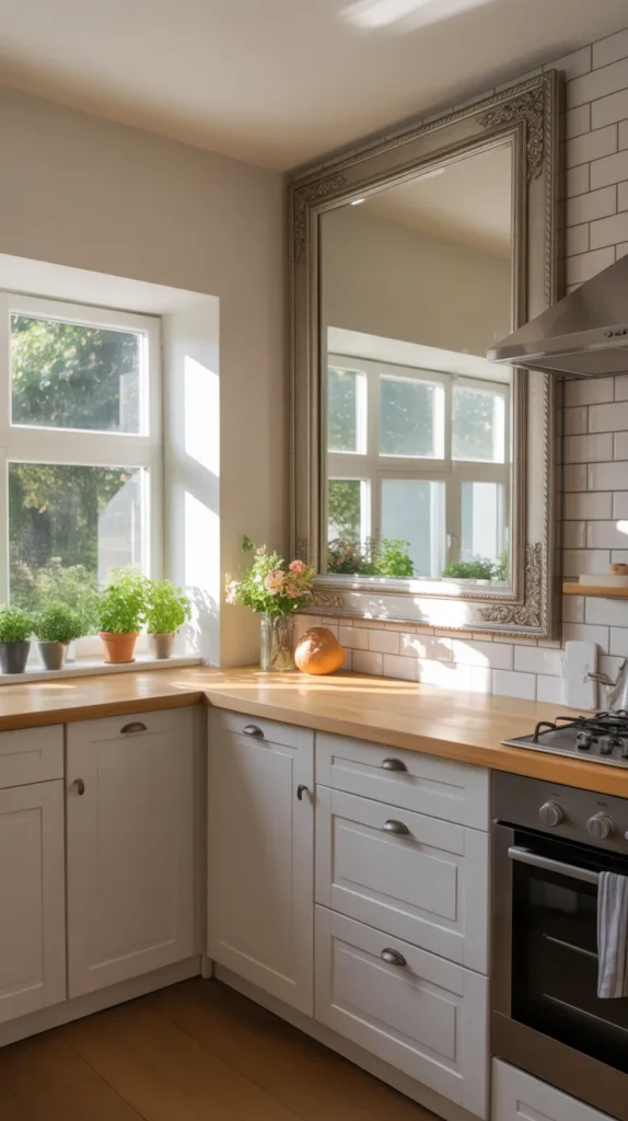 Mirrors aren’t just for living rooms—they can work wonders in kitchens too. A well-placed mirror reflects light, making the space feel brighter and larger. Decorative framed mirrors can also act as statement pieces.