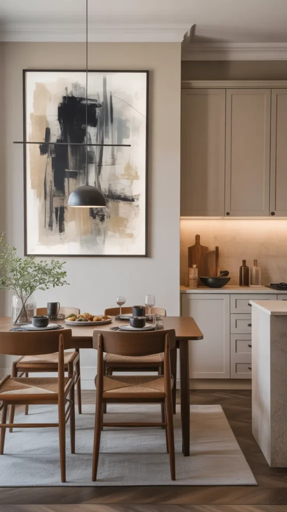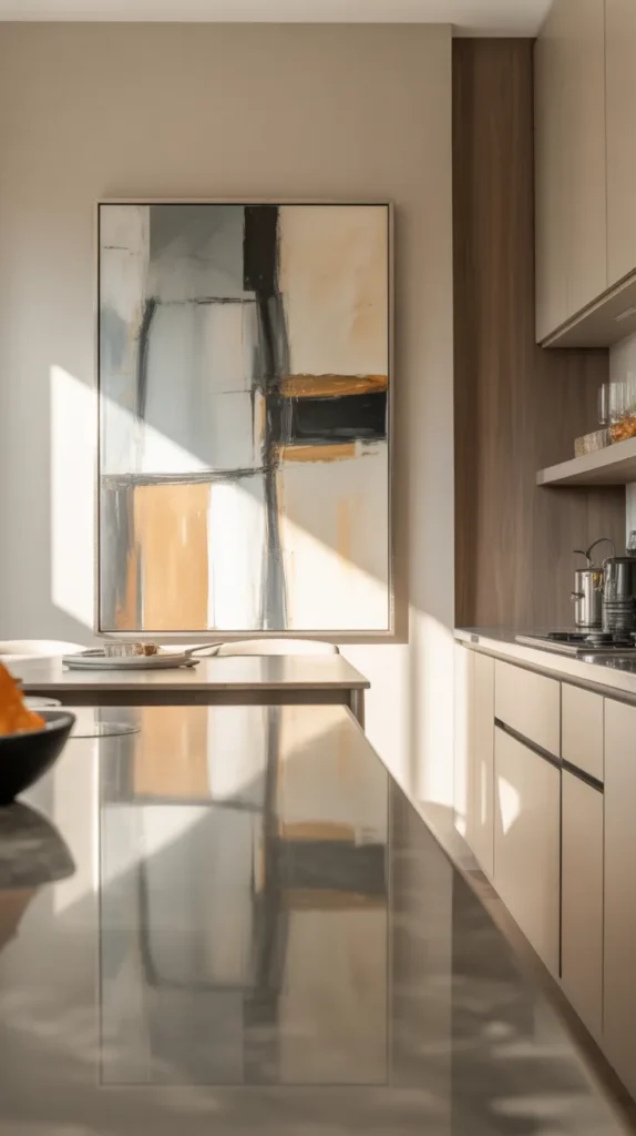Wall art is an easy and impactful way to bring personality into your kitchen. A single large statement piece or a carefully arranged set of artworks can instantly draw attention and become a focal point. Food-inspired illustrations, abstract art, vintage posters, or typography quotes related to cooking work beautifully in kitchen spaces.