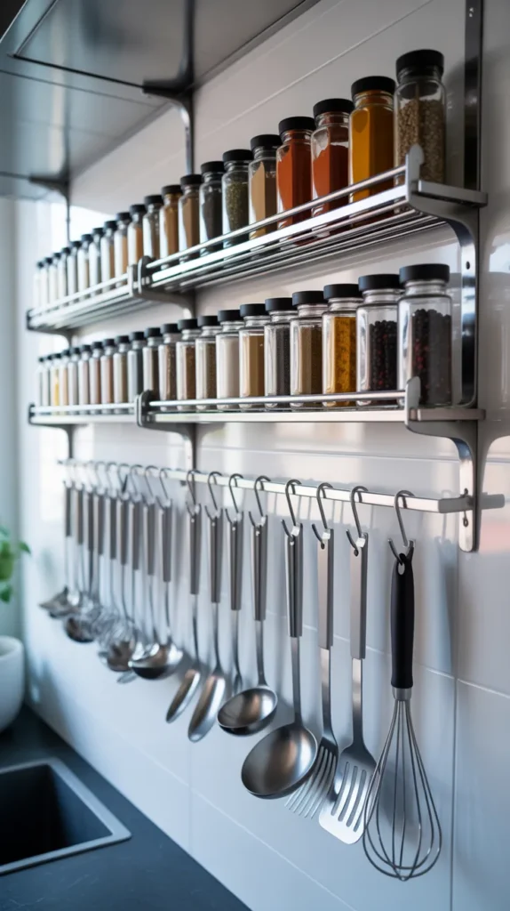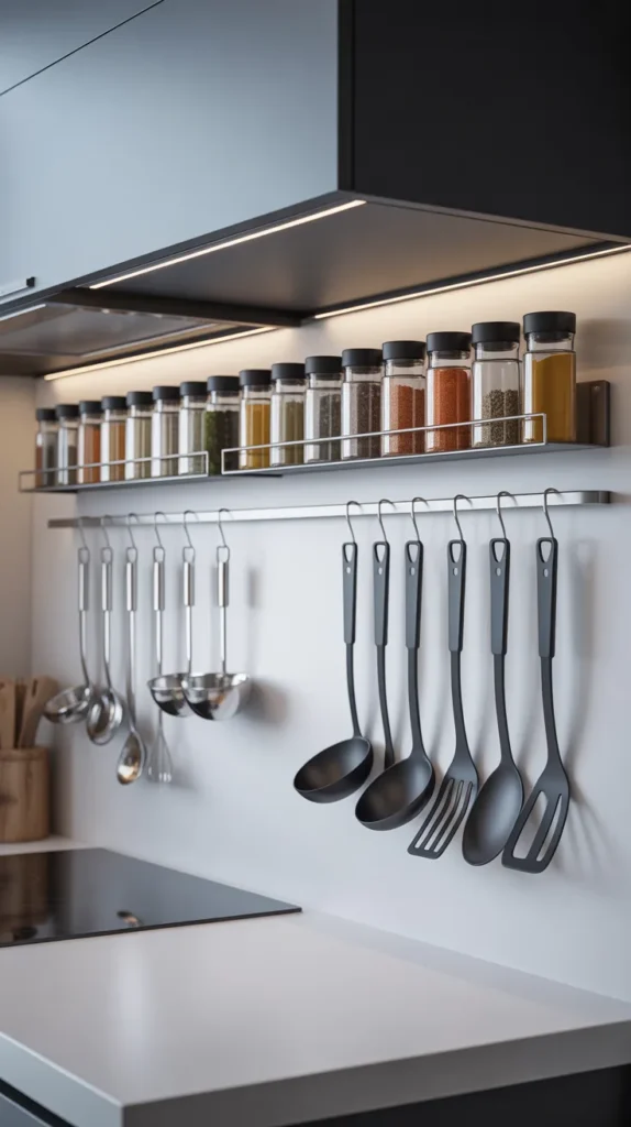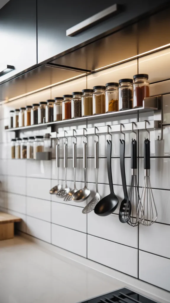 Functional wall-mounted storage can also be decorative. Hanging racks for utensils, spice shelves, or magnetic knife strips save counter space while enhancing the kitchen’s look. Choose materials like wood, brass, or matte black metal for a stylish finish.