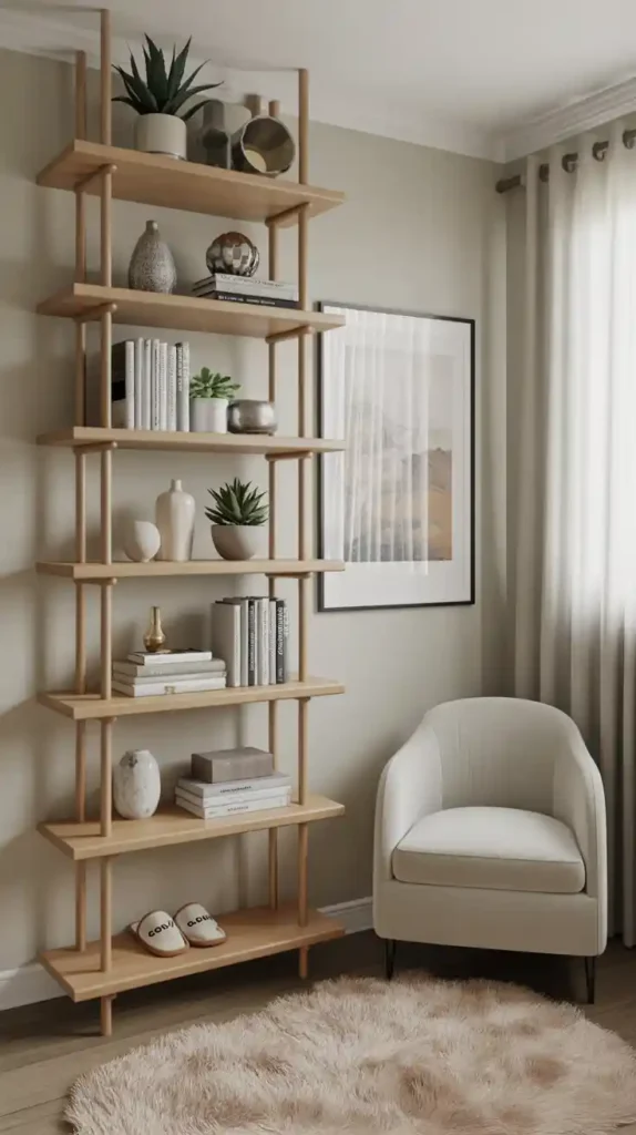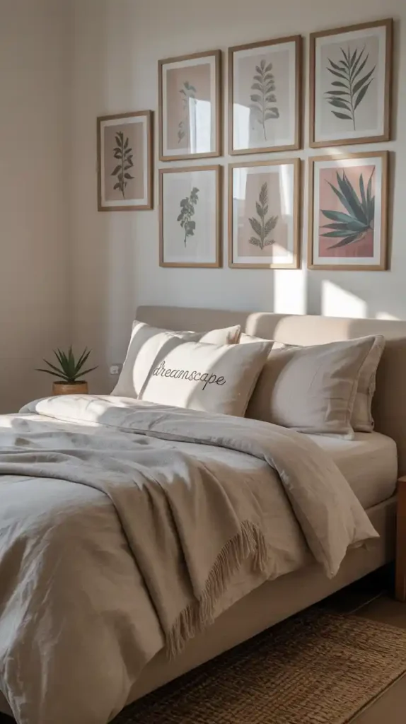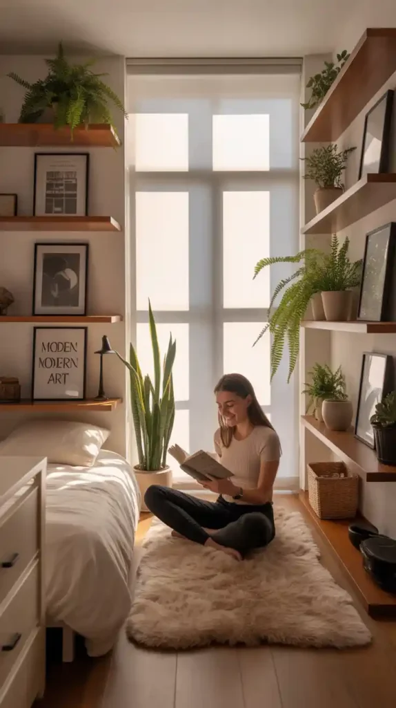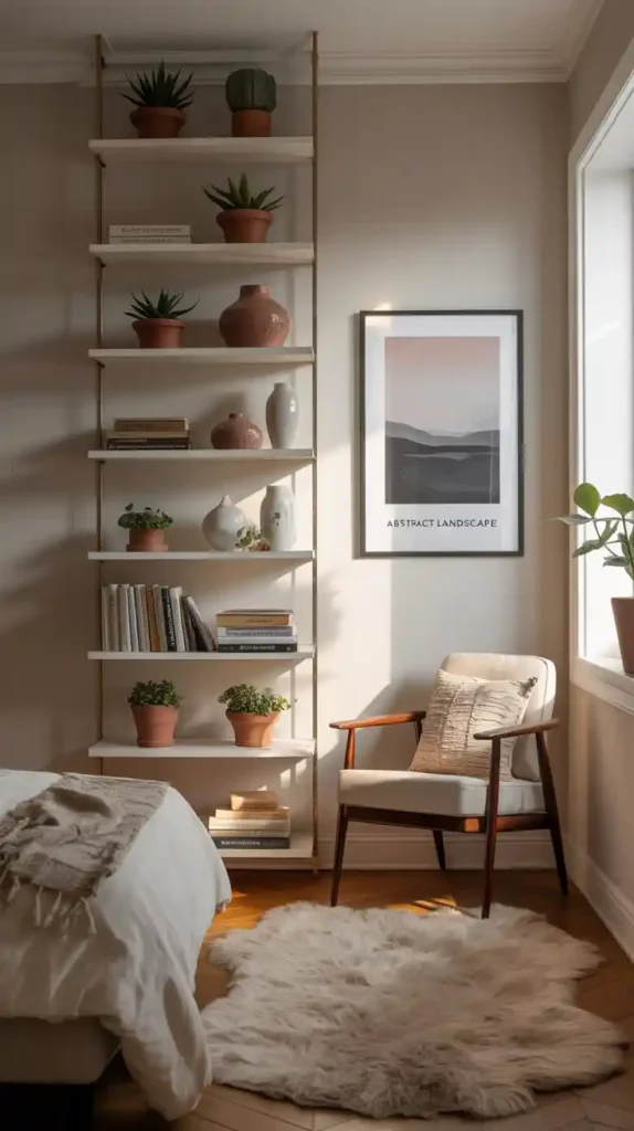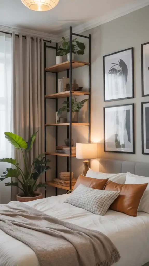When floor space is limited, think vertically. Tall bookshelves, hanging planters, and wall-mounted lamps free up room while adding character. You can even create a gallery wall to bring personality into the space without cluttering the floor. This trick not only maximizes space but also makes your small bedroom look taller.