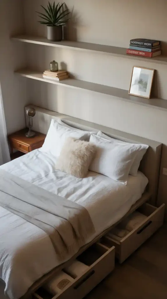 Storage is key in a chic small bedroom. Opt for under-bed drawers, floating nightstands, or storage benches. Wall-mounted racks and vertical shelving units are also great for saving floor space. Keeping clutter hidden will make the room feel more open and inviting. Combine functionality with aesthetics by using woven baskets or stylish storage boxes.