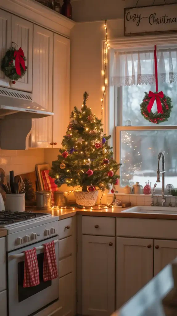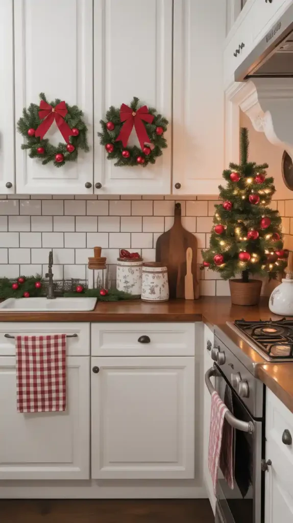 The kitchen is the heart of the home, so bring festive spirit here too. Add holiday mugs, red-and-green dish towels, and mini wreaths on cabinet doors. Place a small decorated tree or gingerbread house on the counter. Scented candles with cinnamon or vanilla make the kitchen warm and inviting, perfect for holiday baking traditions.