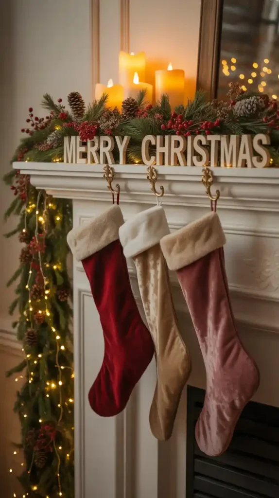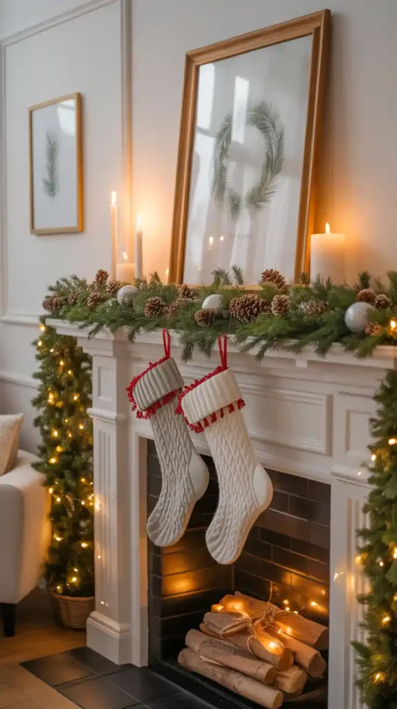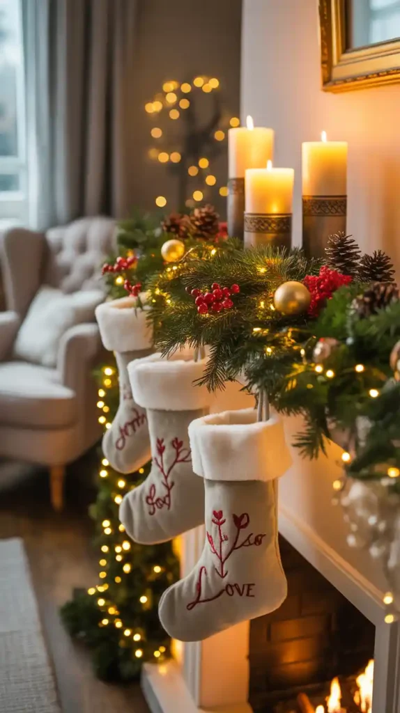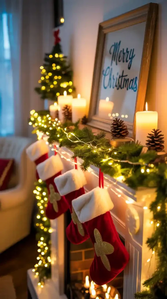 If you have a fireplace, the mantel is a prime spot for Christmas décor. Hang stockings, drape garlands with twinkling lights, and add candles or lanterns. Incorporate seasonal accents like pinecones, berries, and figurines. A beautifully decorated mantel becomes the focal point of the living room, adding festive warmth to the entire space.