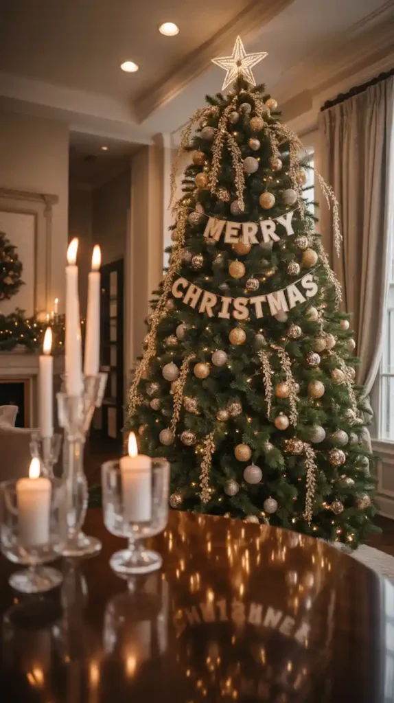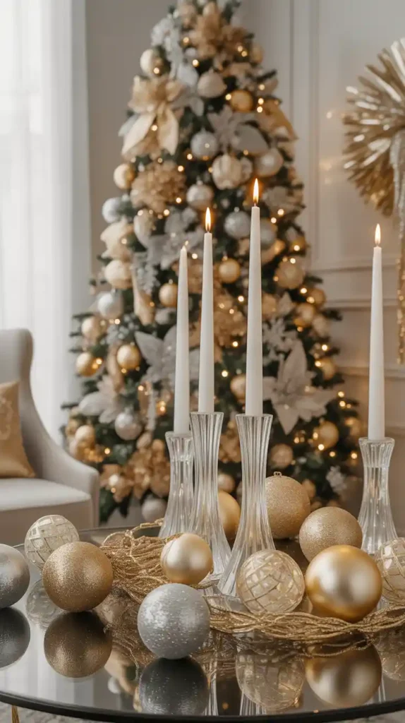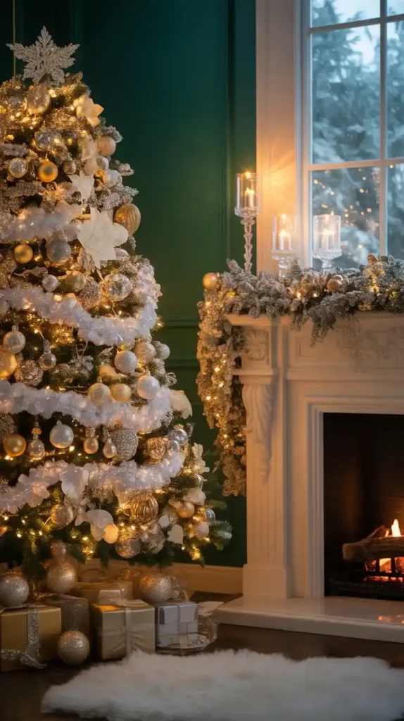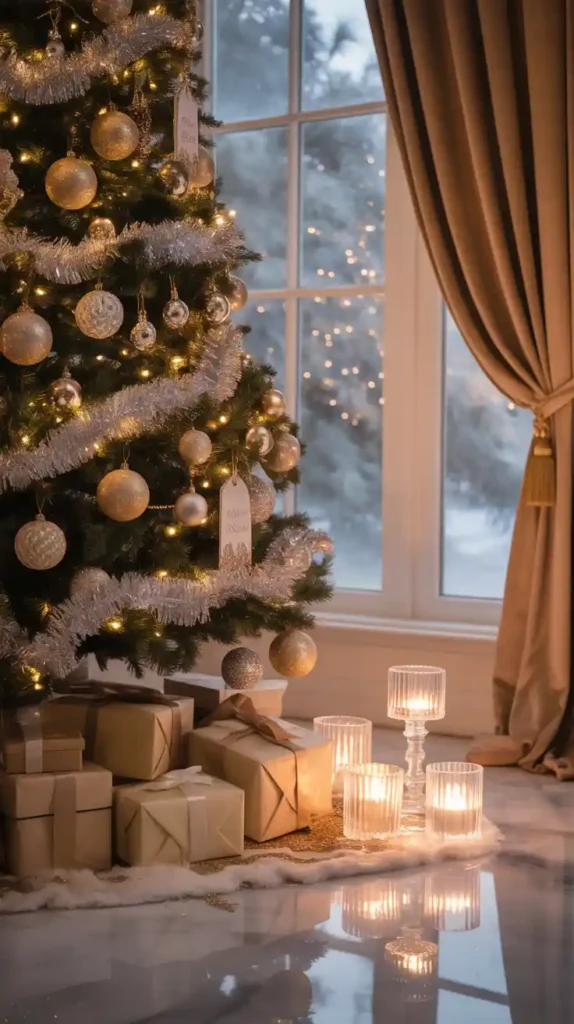 For those who love luxury, a gold-and-silver Christmas theme is a stunning choice. Dress your tree in metallic baubles, glittery ribbons, and shiny garlands. Use crystal candle holders and gold table runners for added sparkle. This color scheme works beautifully with glass ornaments and mirrored surfaces, creating a festive yet glamorous vibe perfect for elegant gatherings.