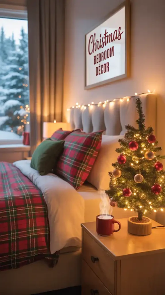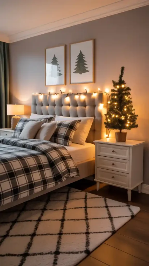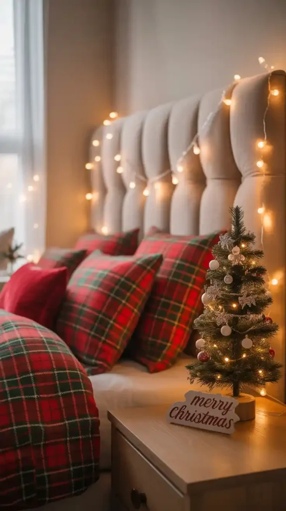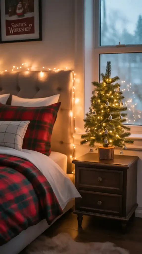 Bring Christmas into your bedroom with cozy touches. Use festive bedding with snowflake or plaid patterns. Add fairy lights around the headboard, and place a mini Christmas tree on the nightstand. Scented candles or string garlands add warmth and relaxation. This creates a magical, cozy retreat for the holiday season.