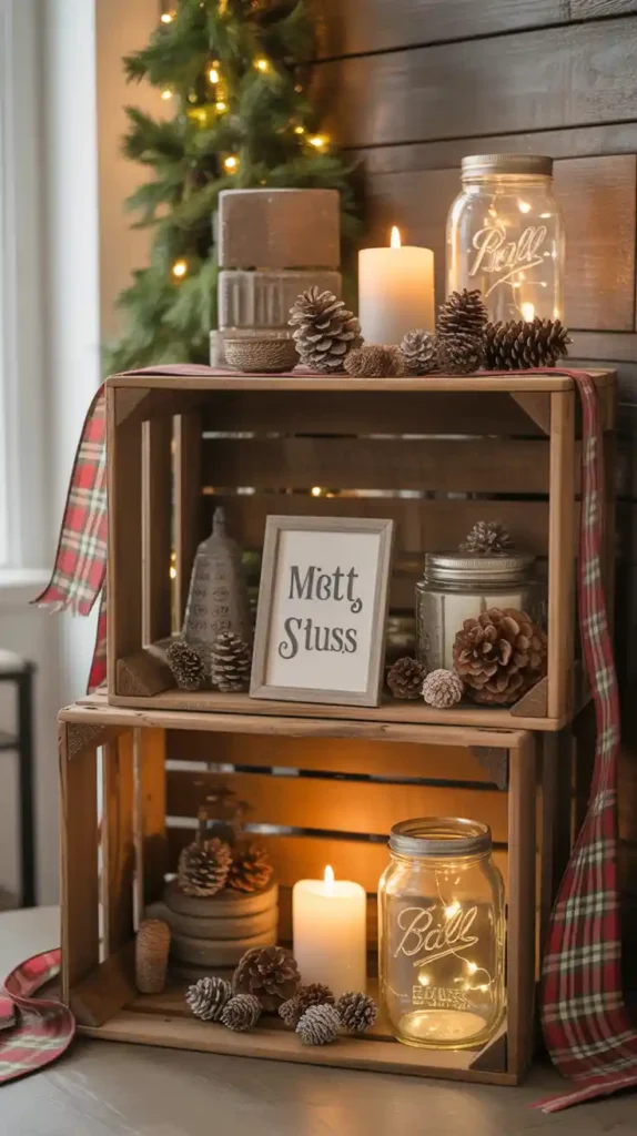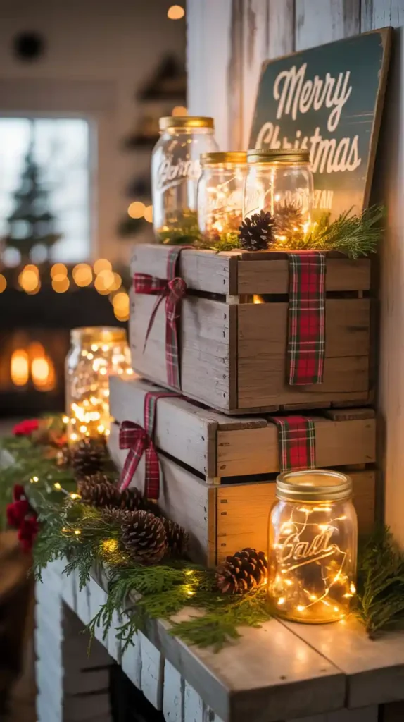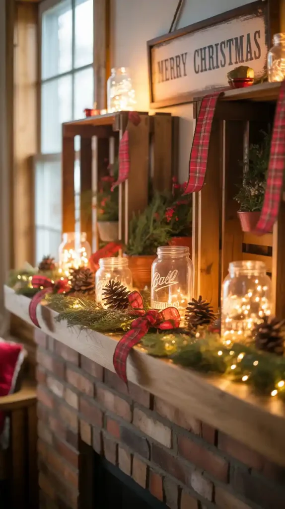 Rustic farmhouse style blends natural textures and vintage charm. Think burlap ribbons, wooden signs, galvanized metal buckets, and plaid patterns. A simple wooden crate with pinecones, candles, and greenery makes a charming centerpiece. Mason jars with fairy lights can be placed on shelves for soft glow. This style emphasizes cozy simplicity, making it perfect for families who love warmth over glamour.