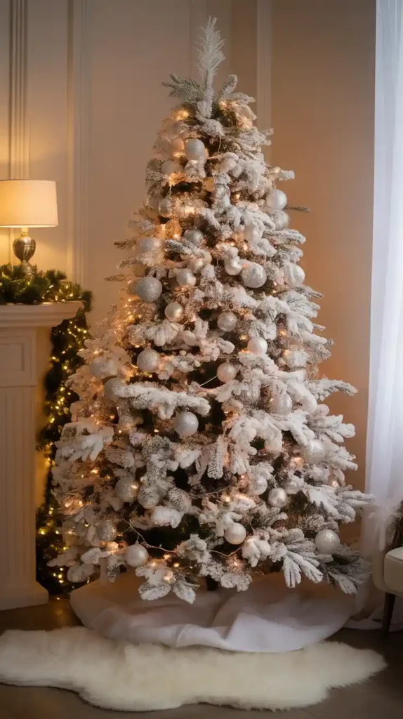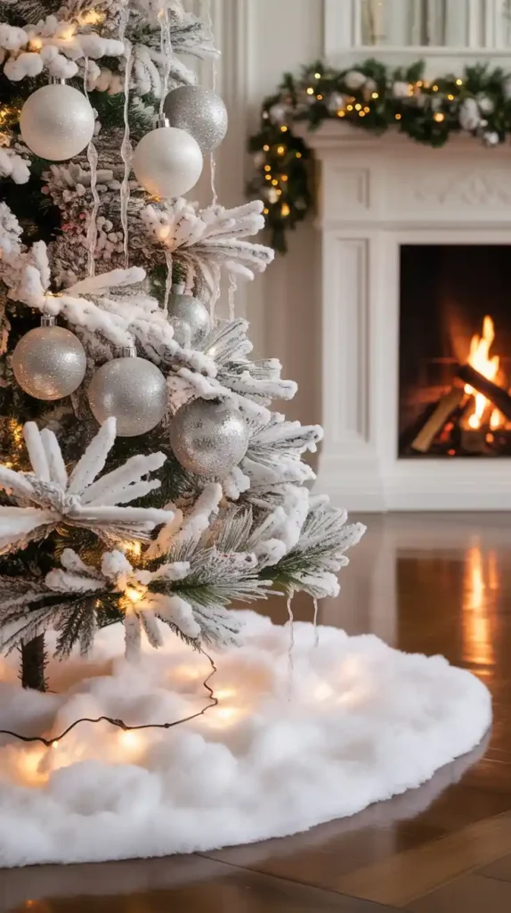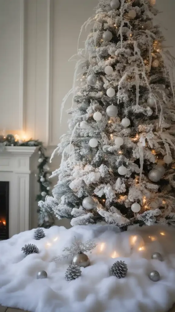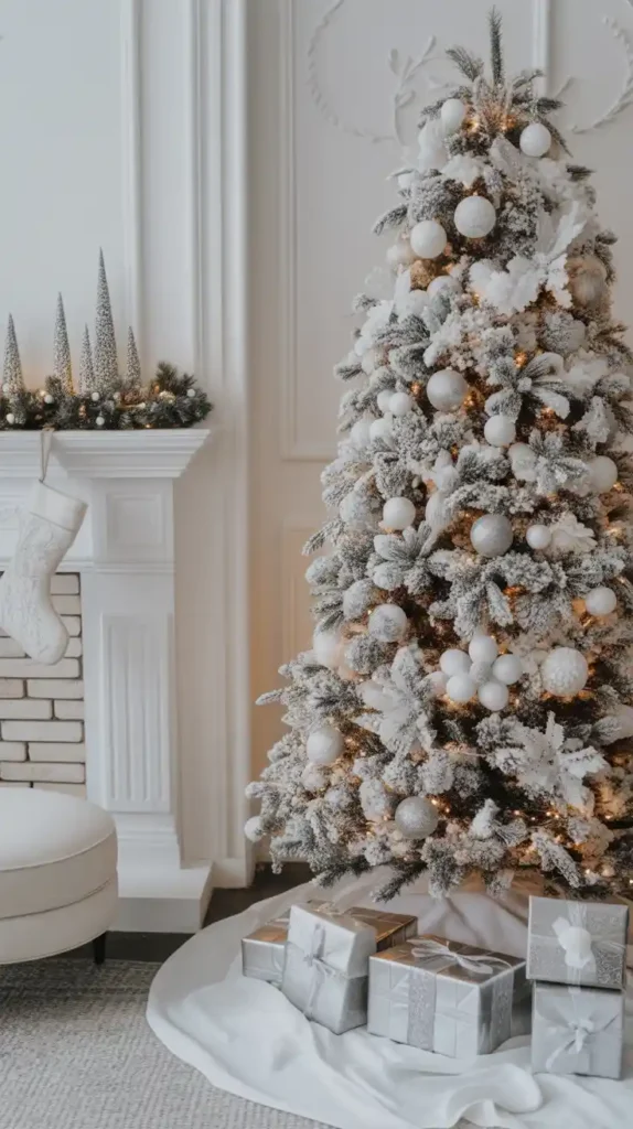 Turn your home into a snowy paradise with all-white Christmas decor. Choose a flocked Christmas tree with silver and white ornaments, faux snow blankets, and icicle lights. Add fluffy white stockings and candles for a dreamy atmosphere. Incorporating metallic accents like silver or platinum adds extra elegance. This minimal yet magical theme makes your space look chic and serene.