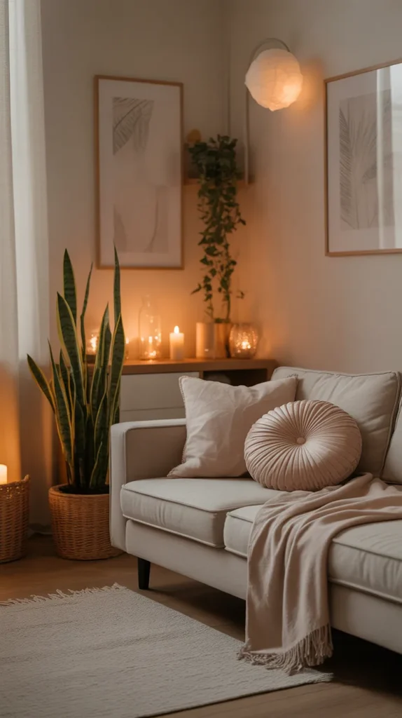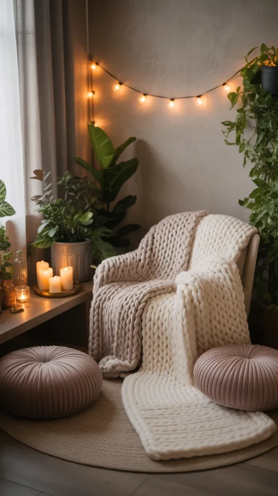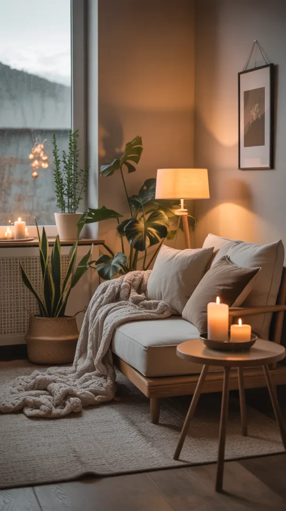 This design idea often includes floor lamps placed beside a reading chair, warm Edison bulbs, bamboo lampshades, candles arranged safely on trays, and golden fairy lights draped around shelves or windows. The goal is to create a spot that feels peaceful and inviting, where you can read, relax, meditate, or enjoy a cup of tea. Soft shadows, warm hues, and layered textures work together to turn even the smallest space into a mini sanctuary.