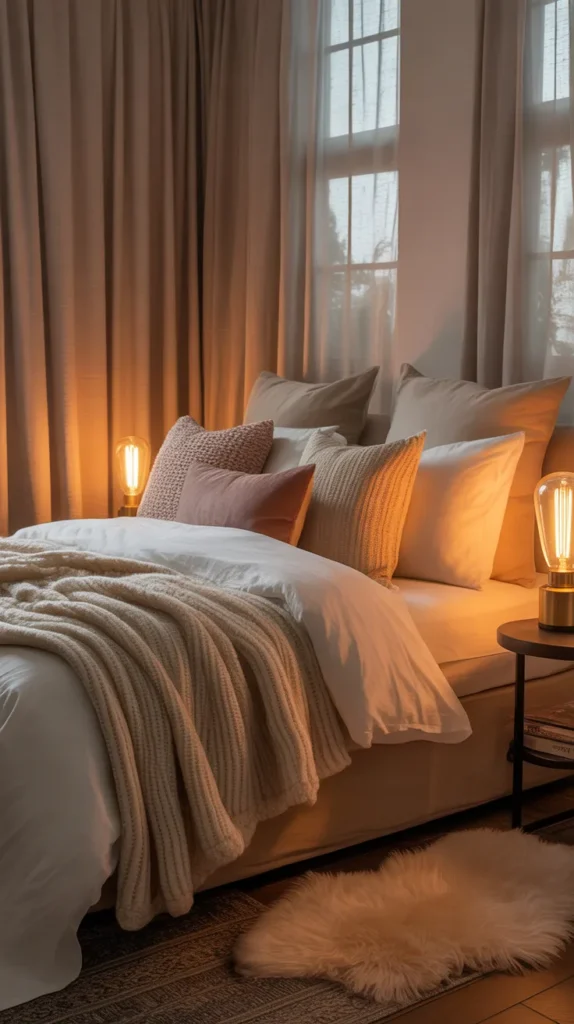 A cozy bedroom often includes fluffy pillows, velvet or cotton blankets, woven rugs, soft bedside lamps, and neutral tones. Adding candles, indoor plants, and soft curtains enhances serenity. Even in a small bedroom, cozy elements create warmth and comfort without overcrowding the space.