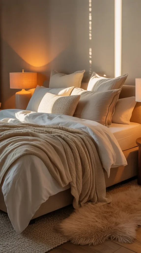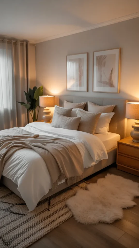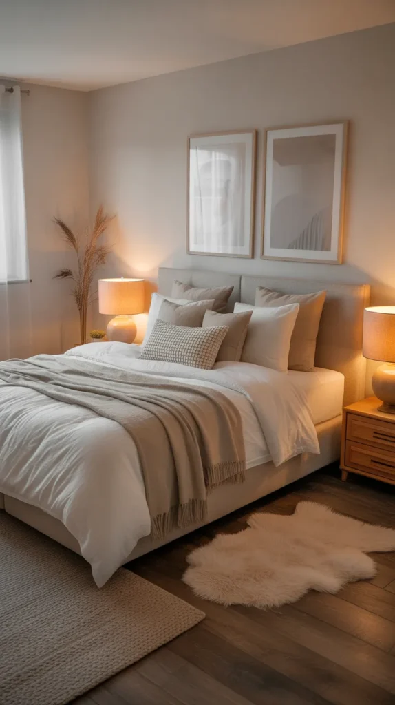 This idea is perfect for living rooms, bedrooms, kitchens, or small homes. Use neutral walls, furniture, and bedding, then layer warm décor elements like cushions, throws, rugs, and art pieces. The result is a clean, elegant, and incredibly soothing environment.