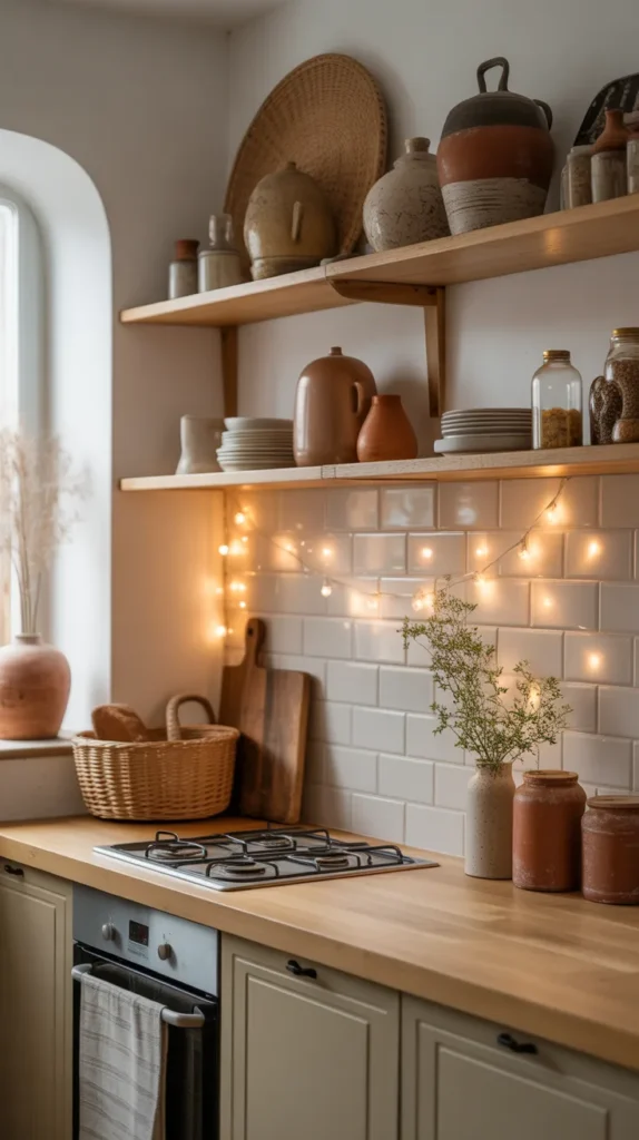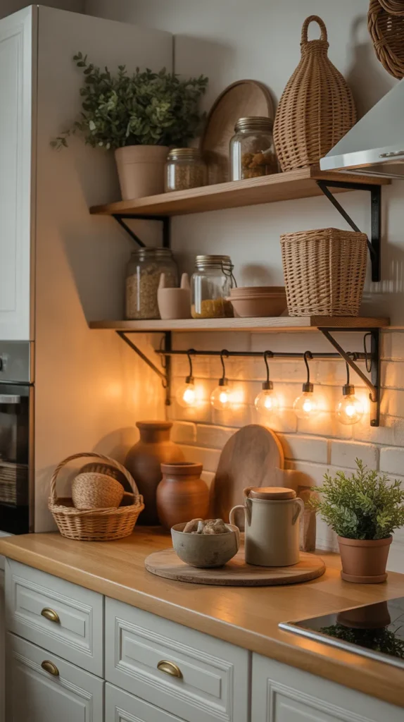 A cozy kitchen is the heart of the home—welcoming, warm, and filled with personality. Creating a cozy kitchen means adding natural textures, soft lighting, warm colors, open shelves, rustic accessories, and intimate seating. Even small kitchens can feel cozy with simple touches like warm countertop lights, wooden boards, ceramic jars, woven baskets, and soft rugs.
