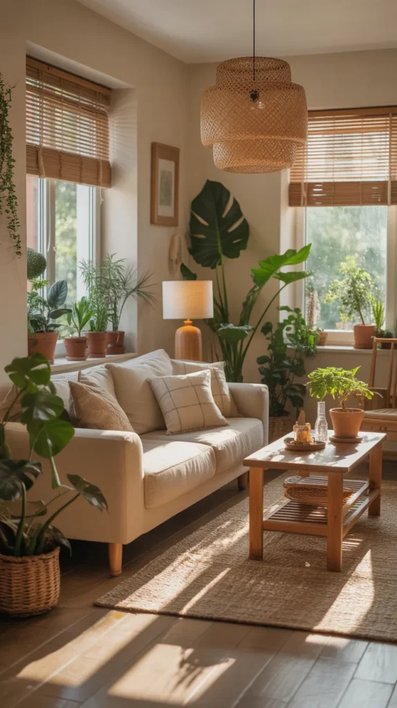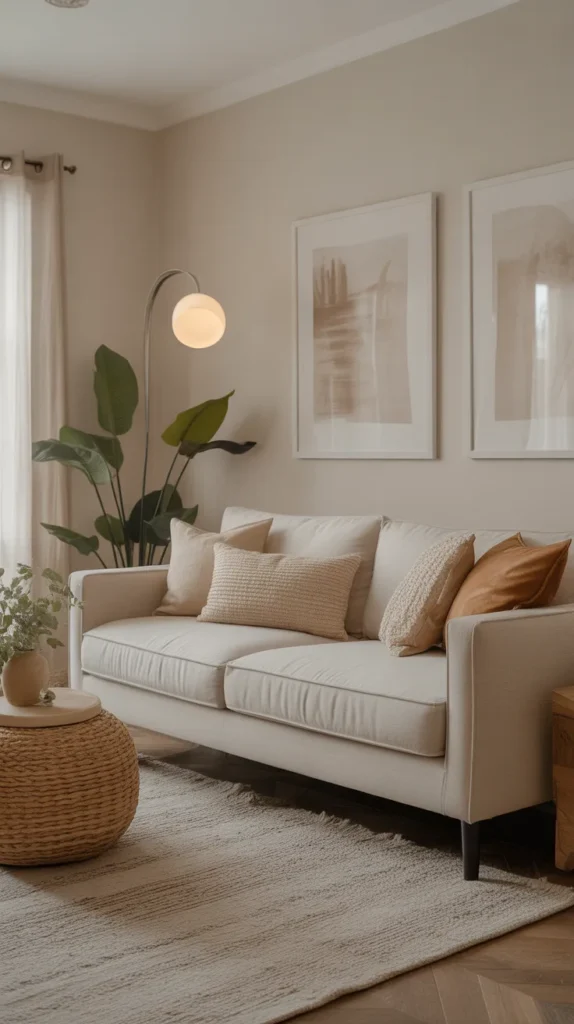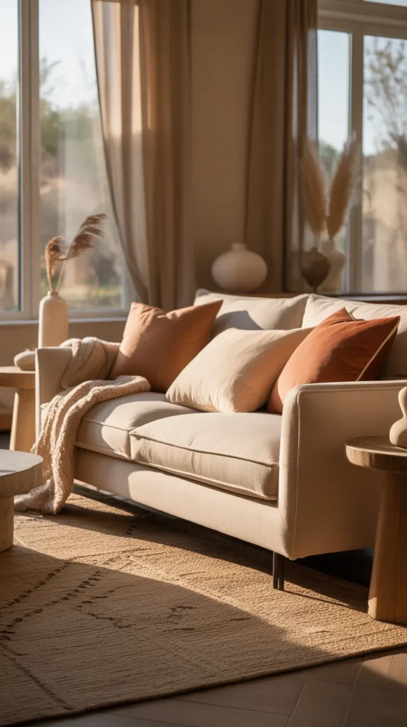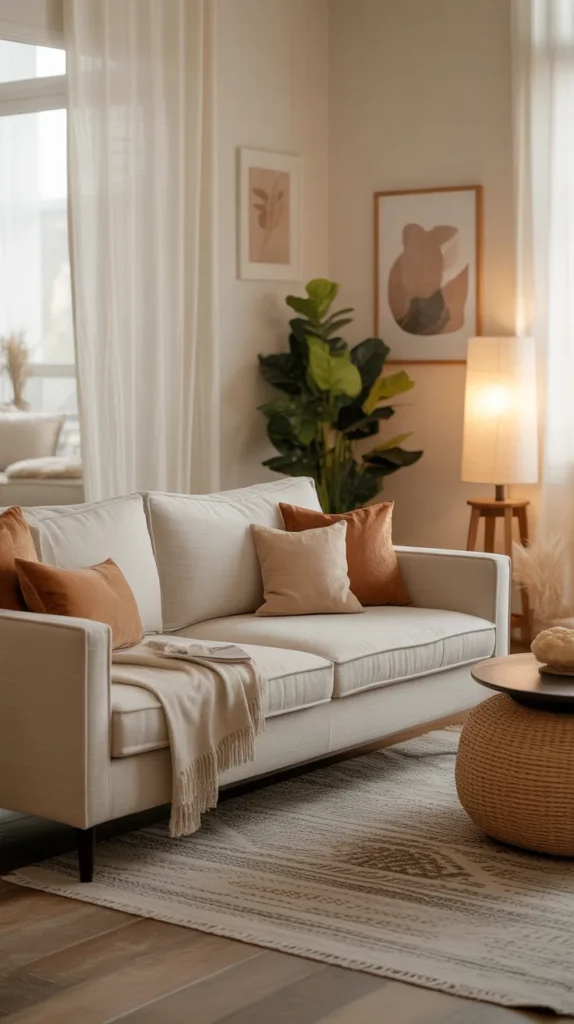 This idea is perfect for living rooms, bedrooms, kitchens, or small homes. Use neutral walls, furniture, and bedding, then layer warm décor elements like cushions, throws, rugs, and art pieces. The result is a clean, elegant, and incredibly soothing environment.