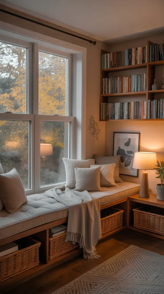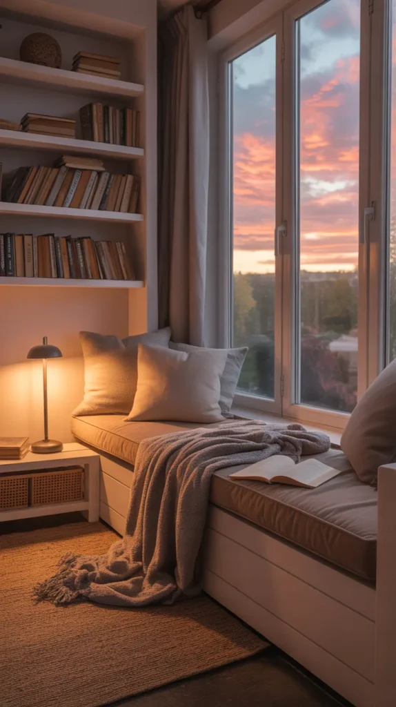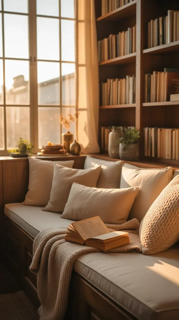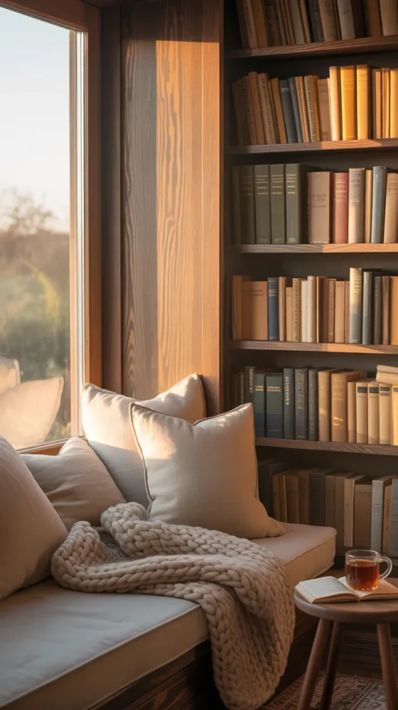 This nook can be under a window, beside a fireplace, in a small bedroom corner, or built into a wall with custom seating. Add fluffy cushions, a small side table for your drink, indoor plants, and a soft rug to complete the space. It becomes your personal escape, inviting you to slow down and enjoy the moment.