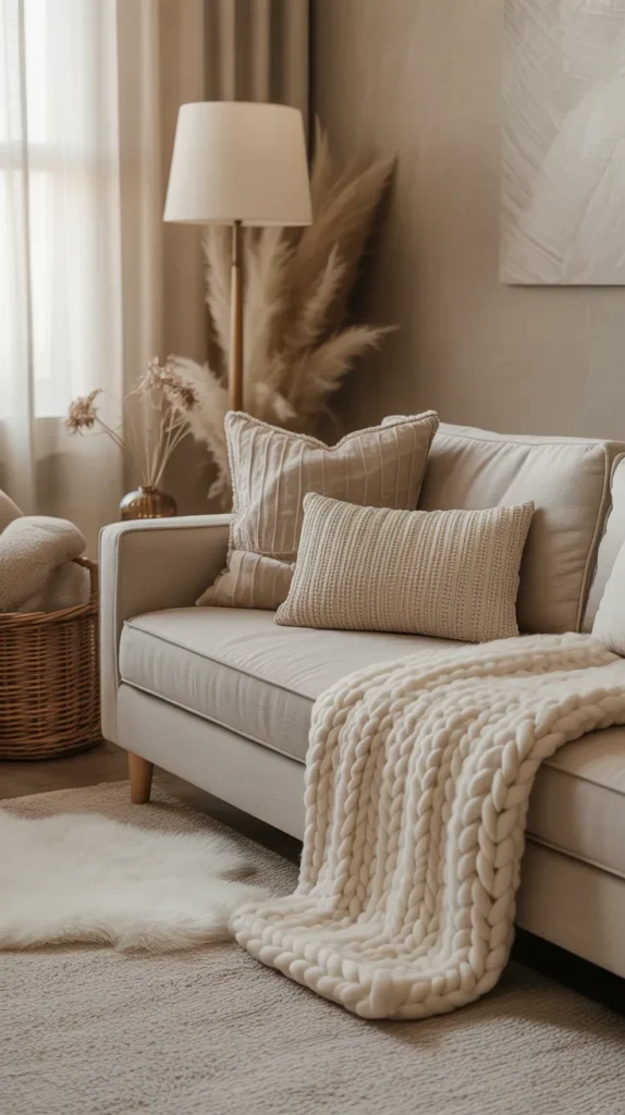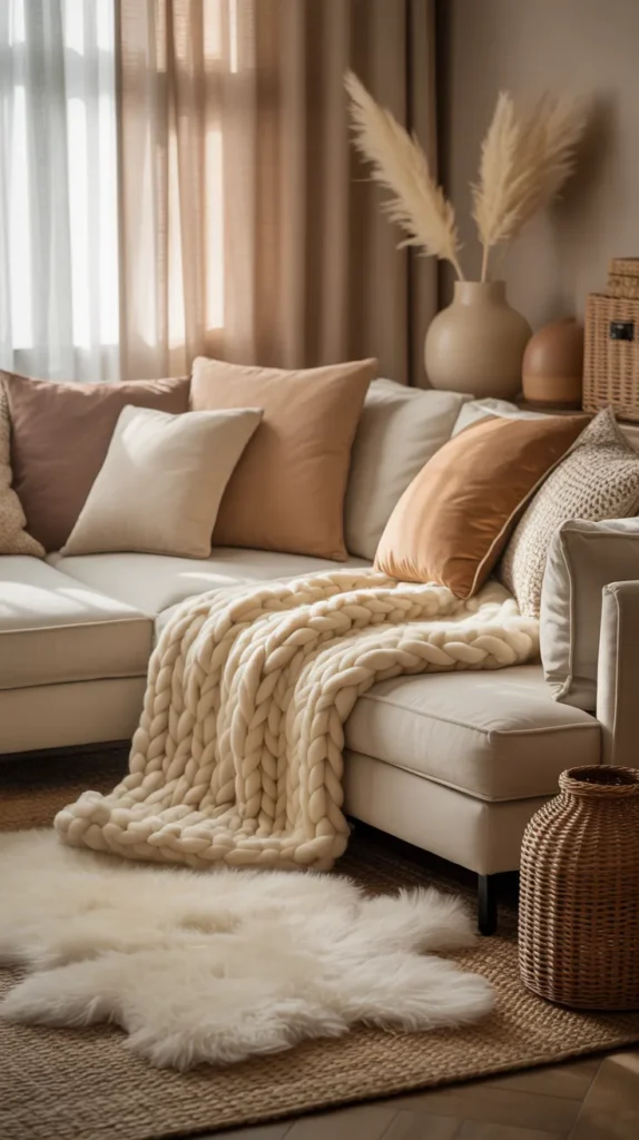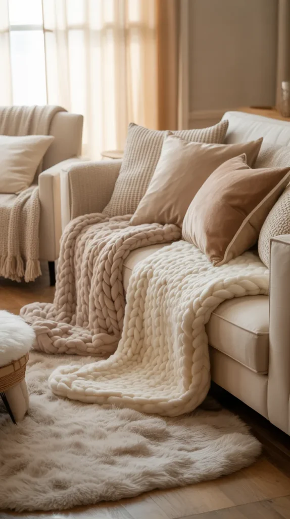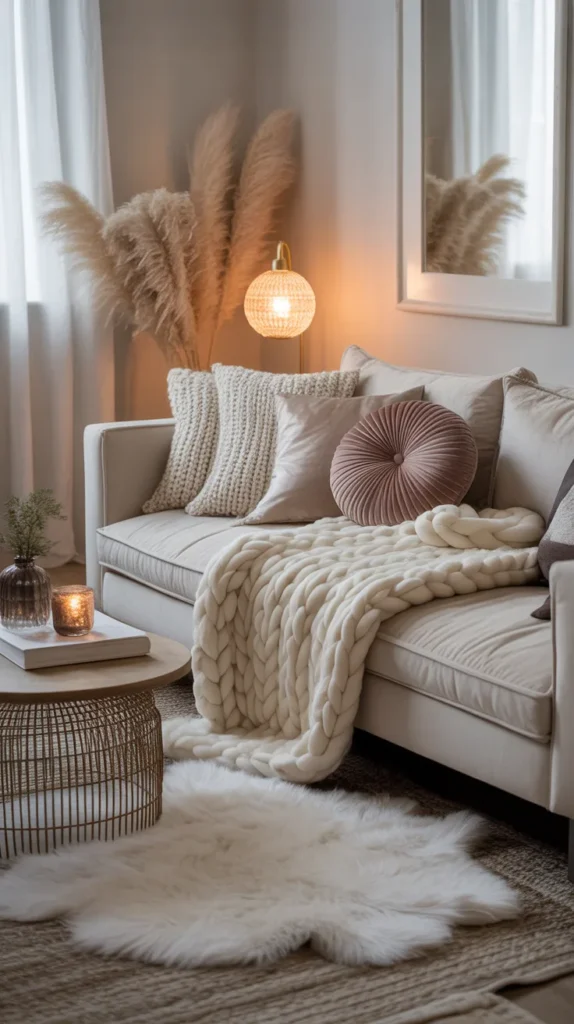 Soft textures can instantly make your house feel more comfortable and inviting. Think plush throws, knitted blankets, cotton cushions, sherpa fabrics, velvet pillows, and cozy rugs. Layering different types of fabrics creates depth and warmth, giving your home a lived-in and welcoming feel. This idea works beautifully in bedrooms, living rooms, or small spaces where comfort matters the most.