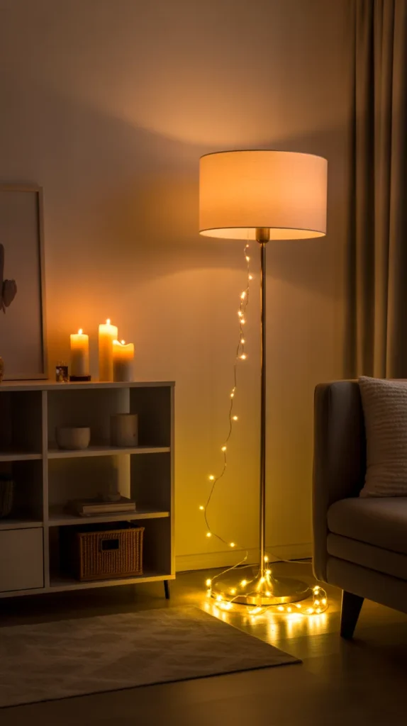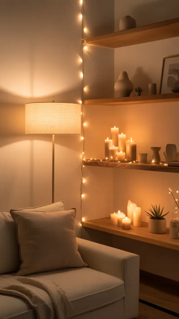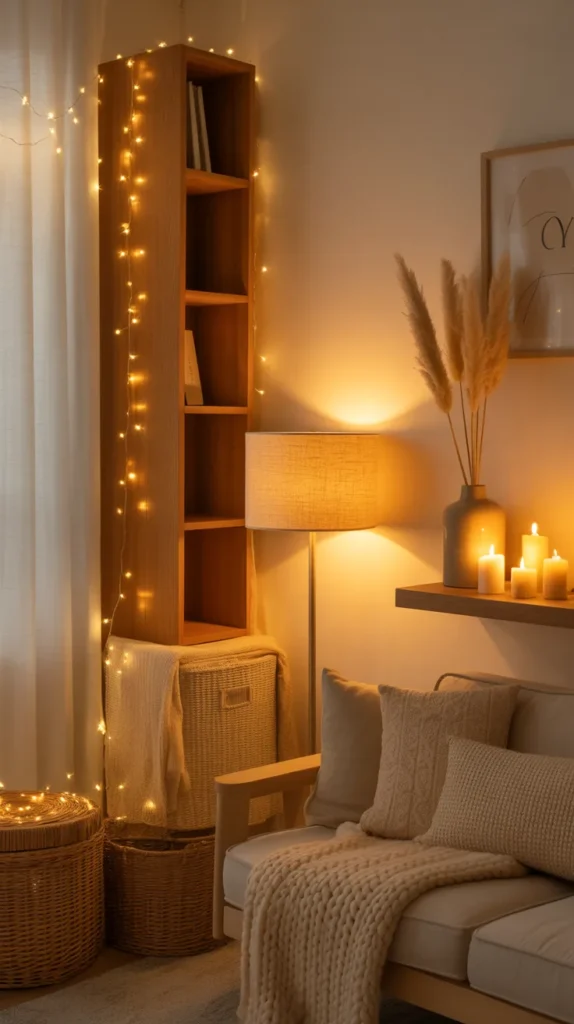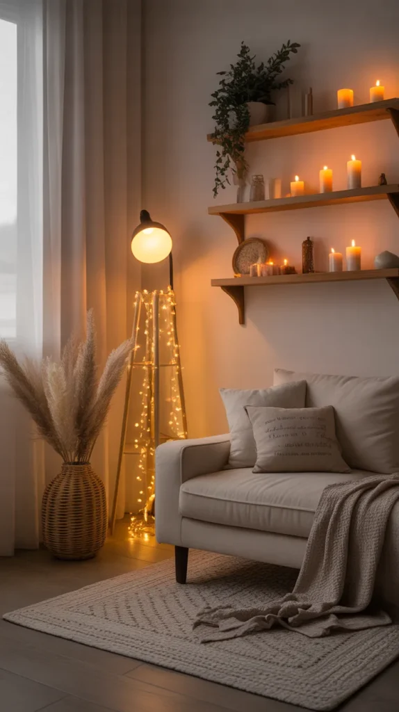 This design idea often includes floor lamps placed beside a reading chair, warm Edison bulbs, bamboo lampshades, candles arranged safely on trays, and golden fairy lights draped around shelves or windows. The goal is to create a spot that feels peaceful and inviting, where you can read, relax, meditate, or enjoy a cup of tea. Soft shadows, warm hues, and layered textures work together to turn even the smallest space into a mini sanctuary.