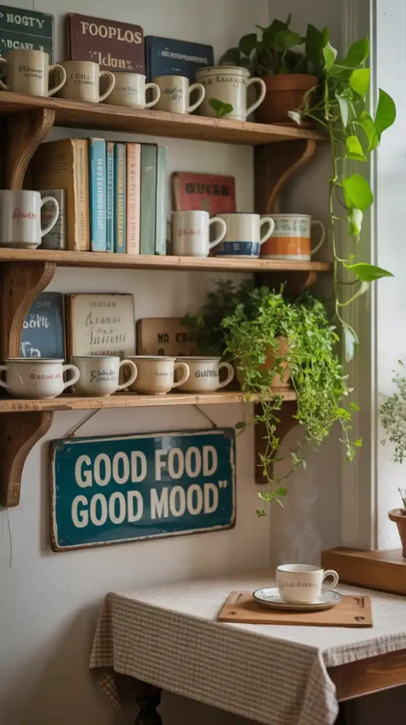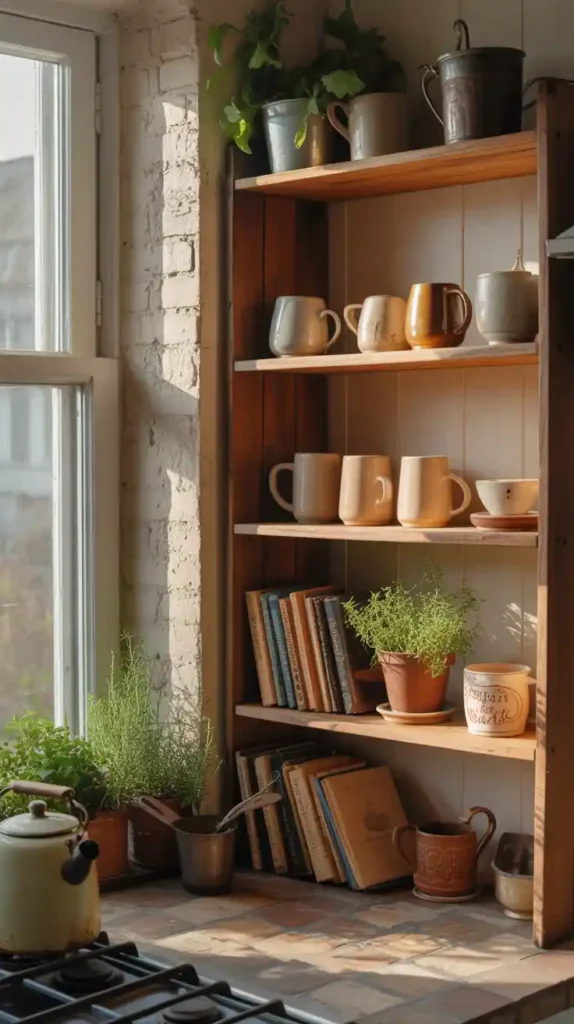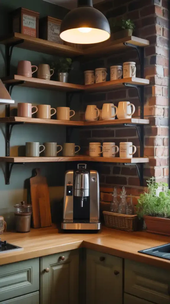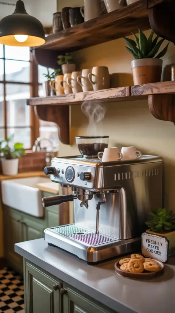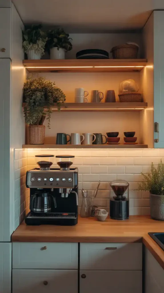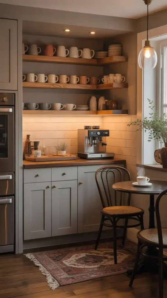 A small coffee or tea station instantly makes your kitchen feel homier. Add a wooden shelf, mugs, a coffee machine, and jars of beans or tea leaves. A cozy corner like this adds charm and daily comfort.