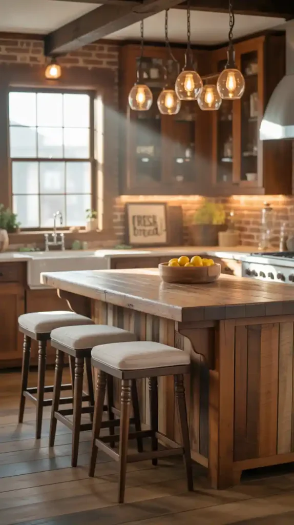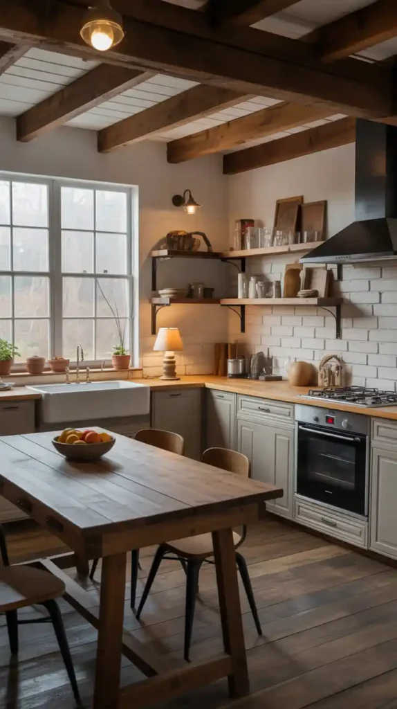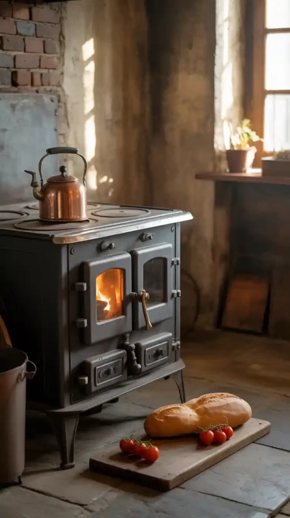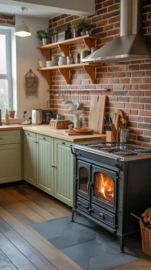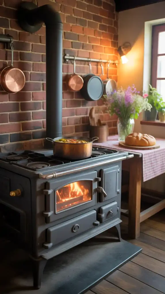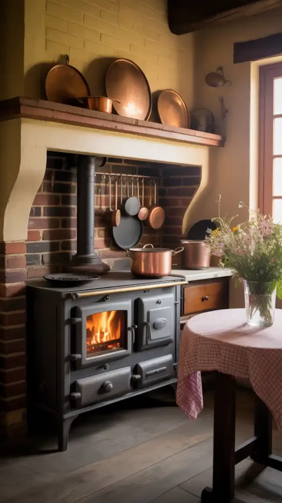 If space allows, a small fireplace or wood-burning stove adds the ultimate cozy touch to your kitchen. Even an electric fireplace with a rustic mantel can create that warm gathering vibe.