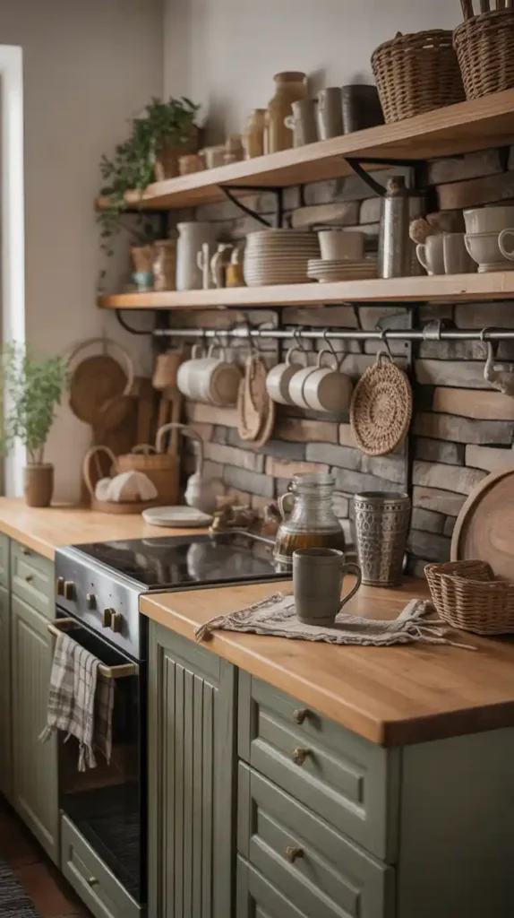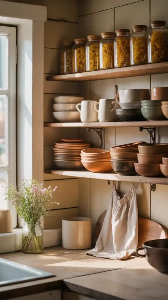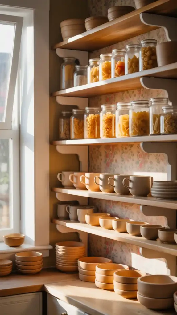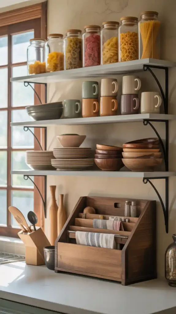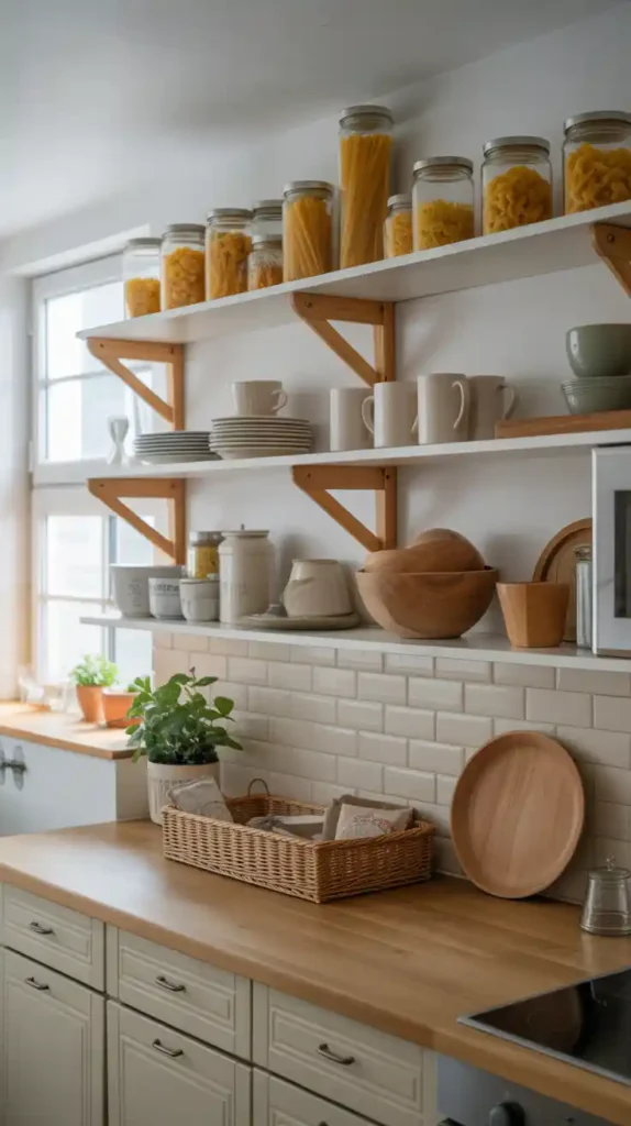 Instead of hiding everything, display your favorite mugs, jars, or cookware. Choose stylish storage like glass jars for pasta, wicker baskets, or ceramic containers. When organized well, everyday items become part of your decor.