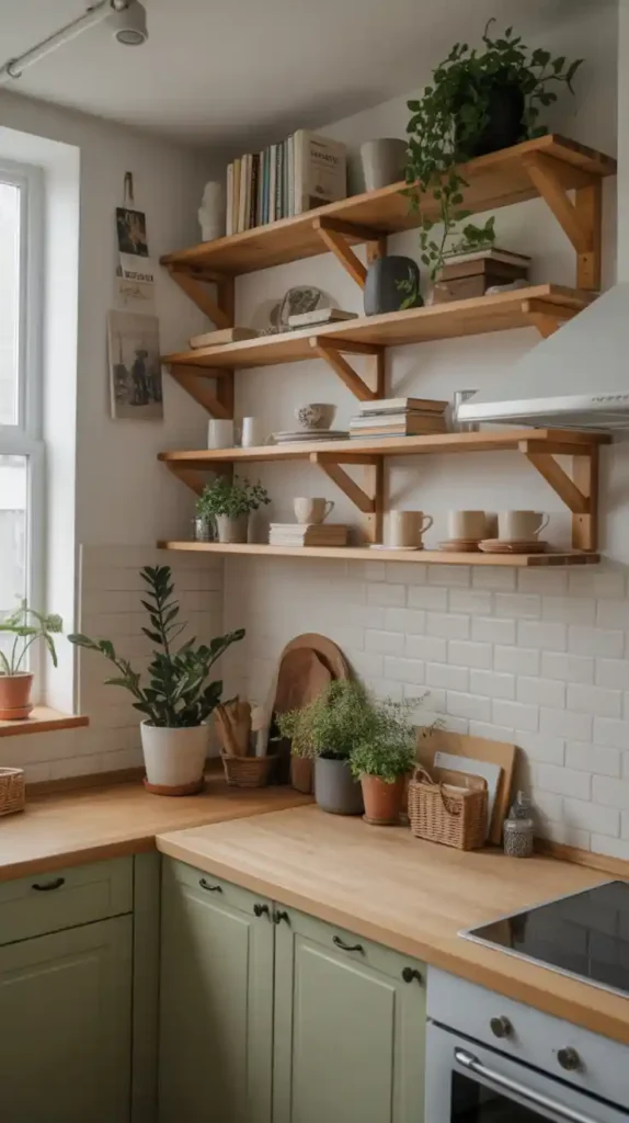 Replace some upper cabinets with open shelves to display everyday essentials or decorative pieces like vintage mugs, cookbooks, or plants. Open shelving gives personality to your kitchen and prevents it from feeling overly sterile. Keep the look cozy by mixing practical items with decor.