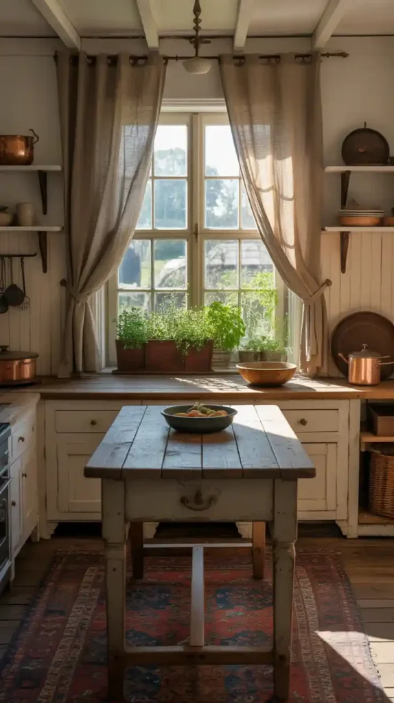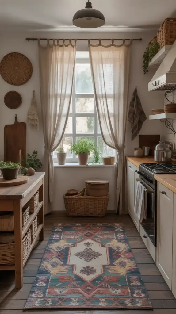 Introduce softness through rugs, curtains, and seat cushions. A patterned runner rug in front of the sink adds warmth underfoot while fabric curtains or Roman shades soften sharp lines. Choose natural fibers like cotton, wool, or linen to elevate the cozy feel.