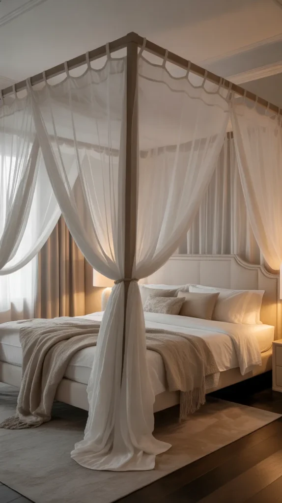 To keep the space balanced, avoid heavy or dark materials. The goal is softness and flow. Pair the canopy with elegant bedding, subtle lighting, and minimal decor. Soft wall colors such as white, cream, or pale gray allow the canopy to stand out without overpowering the room.