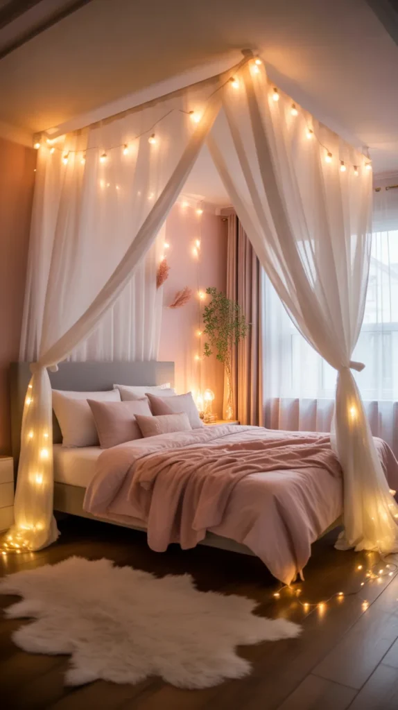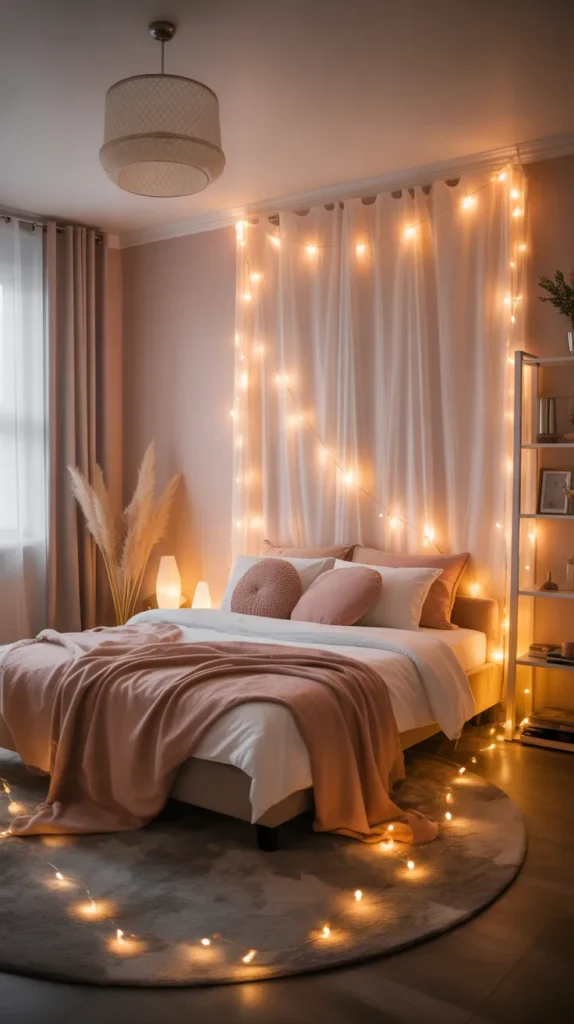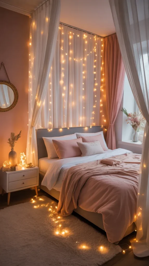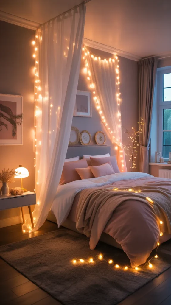 This idea is budget‑friendly and flexible. You can easily change the look by switching between warm white lights for romance or soft yellow tones for extra coziness. It’s especially popular in boho, teen, and minimalist bedrooms.