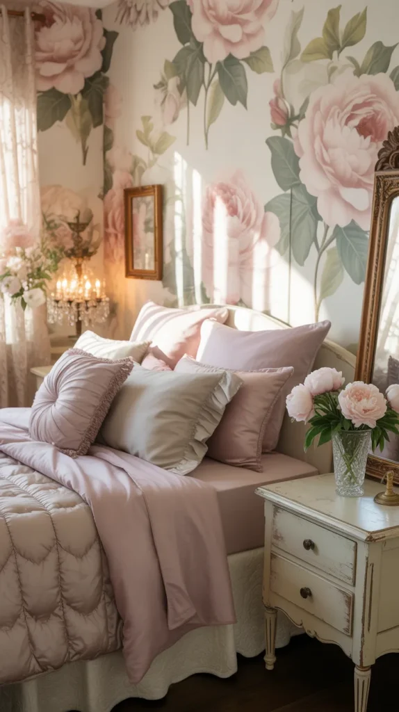 Pair florals with vintage‑inspired furniture, soft lighting, and pastel or neutral backgrounds. The result is a charming, elegant bedroom that feels timeless and romantic.