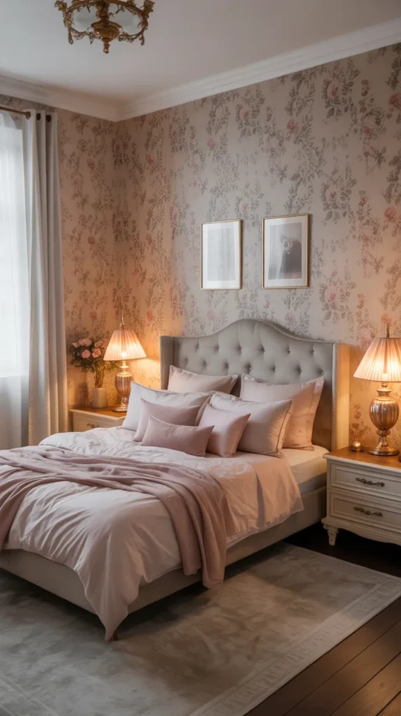 Floral elements add romance and softness to a bedroom. This can be achieved through floral wallpaper, bedding, or subtle decor accents. Soft floral patterns in muted colors work best for a dreamy look.