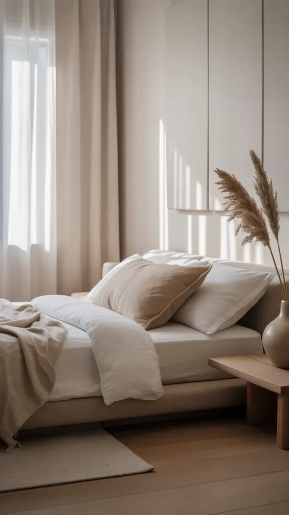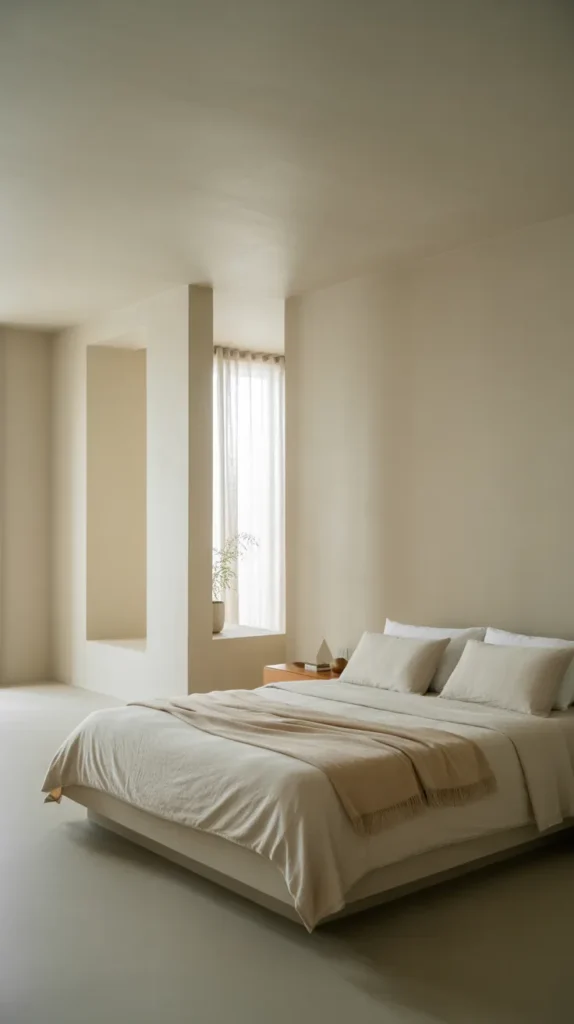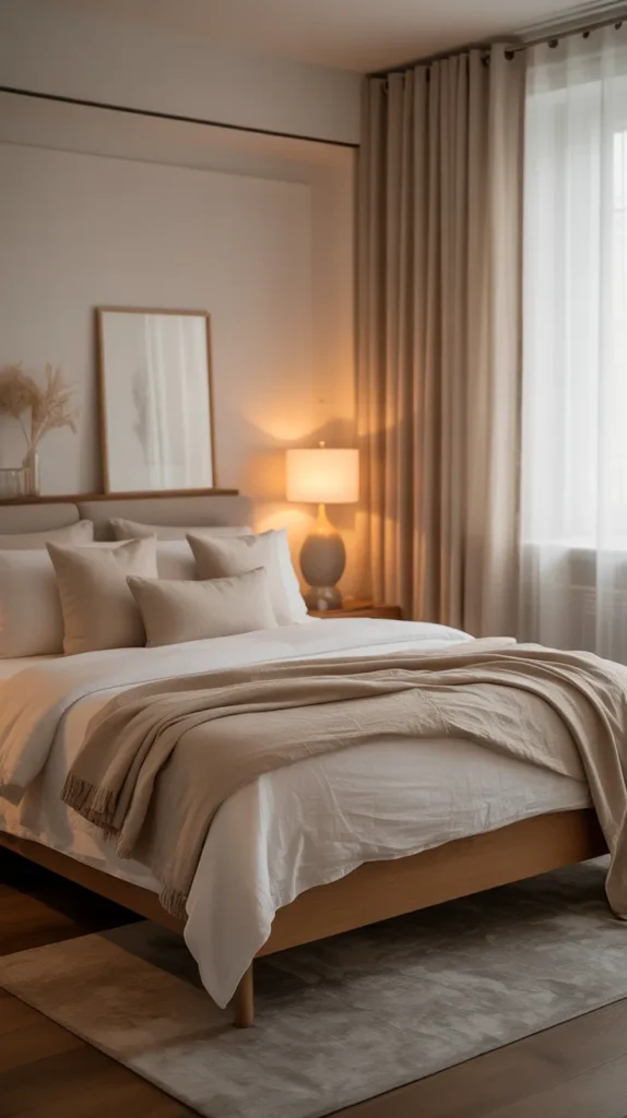 A soft neutral bedroom is the foundation of dreamy design. This style relies on calming shades like ivory, beige, warm white, taupe, and light greige to create a peaceful, airy environment. The magic lies in layering these neutrals rather than keeping everything flat. For example, combine an off‑white wall color with a cream upholstered bed, beige linen bedding, and textured throw blankets.
