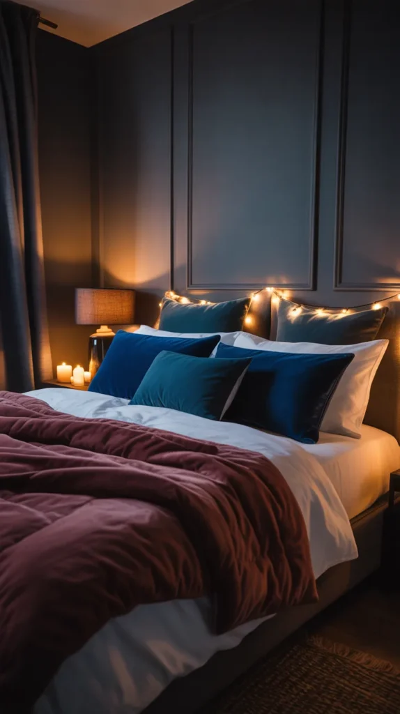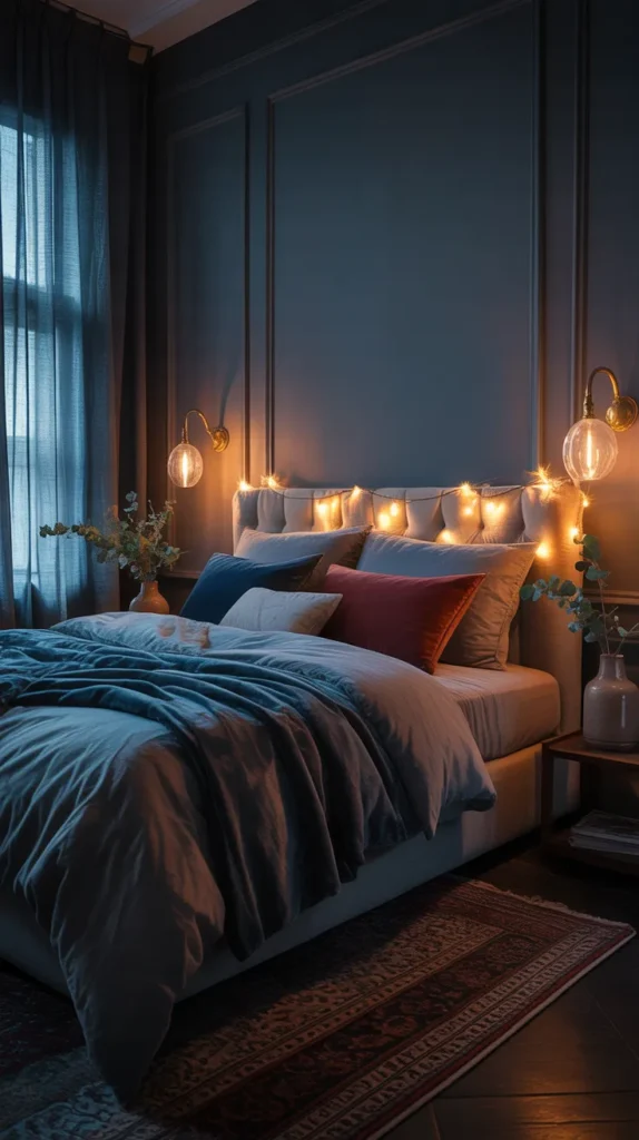 A moody bedroom uses darker tones like deep blue, charcoal, or forest green while still feeling soft and dreamy. The key is warm lighting and plush textures to balance the darkness.