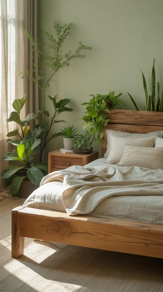 Nature‑inspired bedrooms bring the outdoors inside. Earthy tones, wooden furniture, plants, and natural light create a calming, grounded space. Soft green, beige, and brown shades work beautifully here.